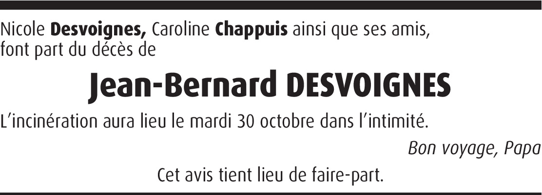 Nicole et Caroline, c'est avec beaucoup de tristesse que nous venons d'apprendre le décès de Jean-Bernard. Nous sommes en pensées avec vous en ces moments douloureux de séparations. Nous vous présentons toutes nos condoléances. Peter et Fabienne Bleuer( d'anciens voisins)