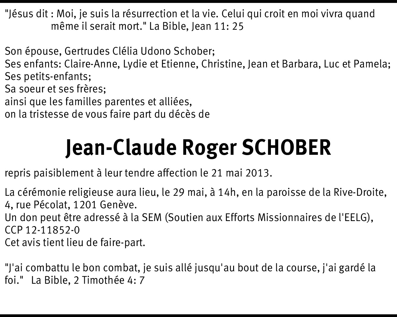 Chère famille et chers amis de l'EELG, nous vous adressons ici tous nos encouragements, notre affection fraternelle et nos sincères condoléances. Que Dieu vous accorde sa consolation. Oui, Jean-Claude a combattu le bon combat et il a gardé la foi, la couronne de justice lui est réservée. Il a servi le Seigneur de tout son coeur ici et au Brésil de manière exemplaire et son témoignage reste un encouragement pour beaucoup. L'Eglise évangélique de Réveil et ses pasteurs.