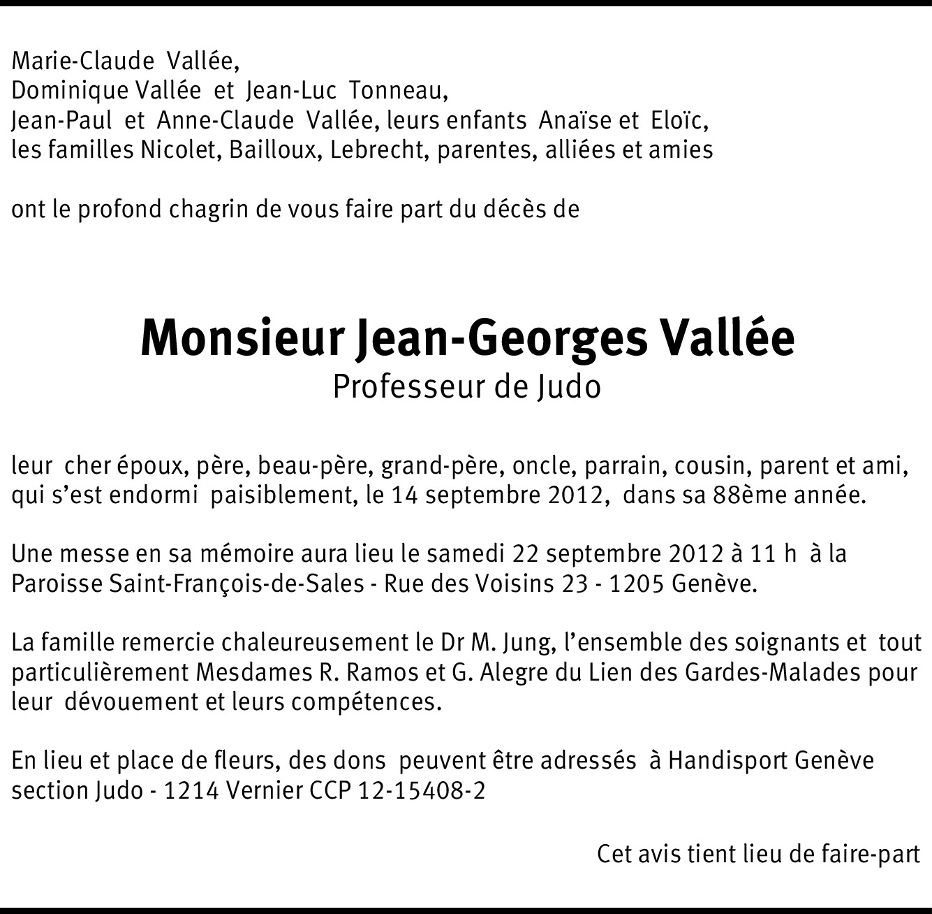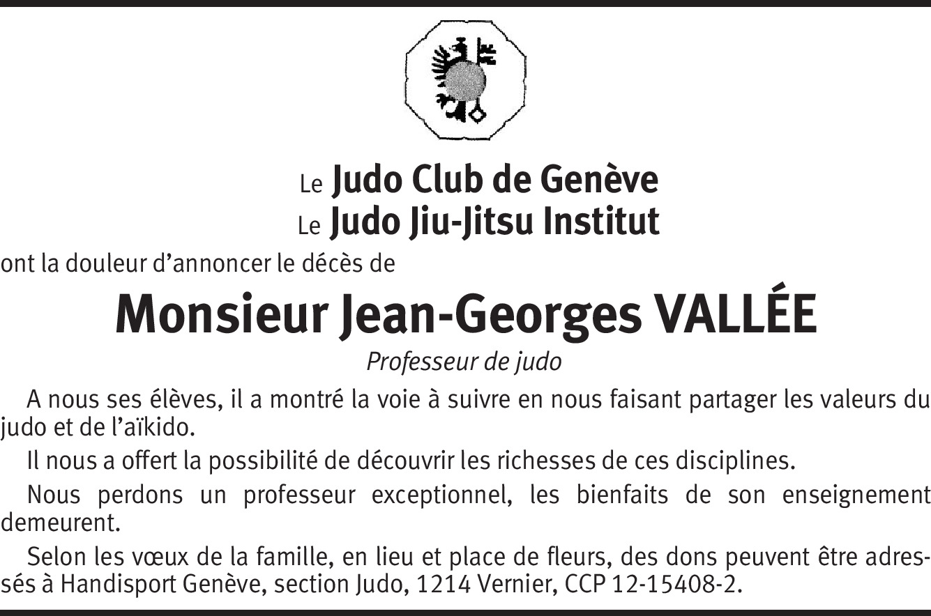 Ils se souviendrons de la gentillesse, de la générosité et de la maitrise de Jean-Georges Vallée, qui a initié et formé plusieurs de leurs enfants à ces arts martiaux qu'il savait si bien transmettre avec foi discipline et enthousiasme.