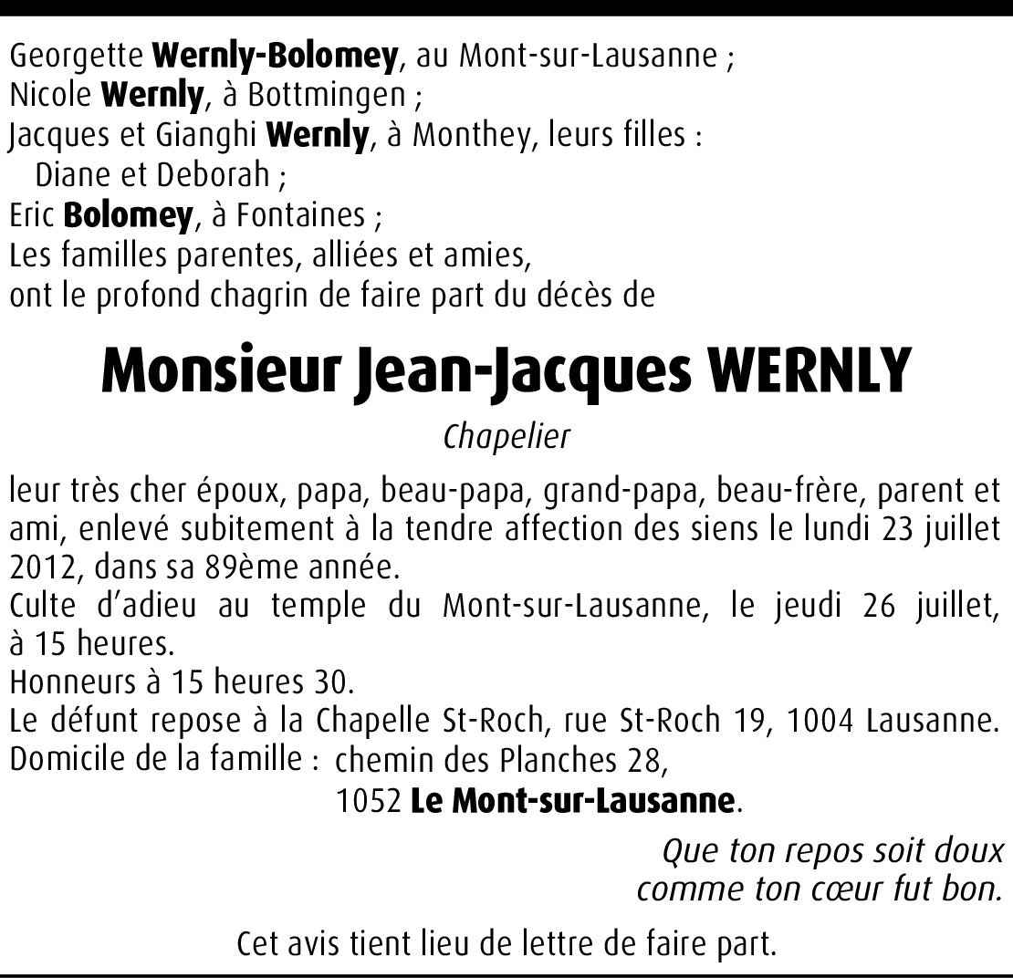 Ayant appris le décès de votre époux par maman, je vous prie d'accepter toutes nos condoléances. Je ne pourrai malheureusement pas être présente à la cérémonie, étant en vacances en France. Avec mes meilleures salutations. Mumu et François Guignet Fritsché