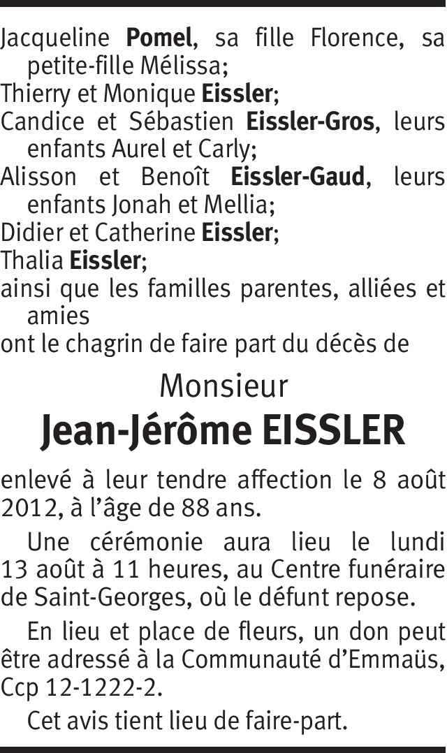 Il y a plus de 4 ans Signaler Je garderai toujours un bon souvenir de Jean-Jérôme que j'ai connu dans la cadre de mon travail. Recevez mes sincères condoléances. Raymond Nicollerat De la part de Raymond Nicollerat