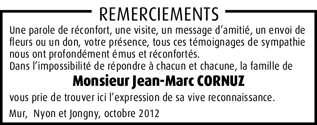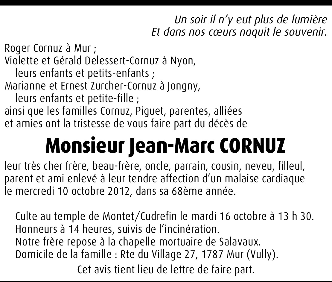 Il y a plus de 4 ans Signaler En pensées avec vous en ce temps de séparation et de douleurs. Que le Christ manifeste sa présence à vos côtés par sa consolation l'espérance du revoir. Avec notre amitié et condoléances sincères. De la part de Philippe Cornuz