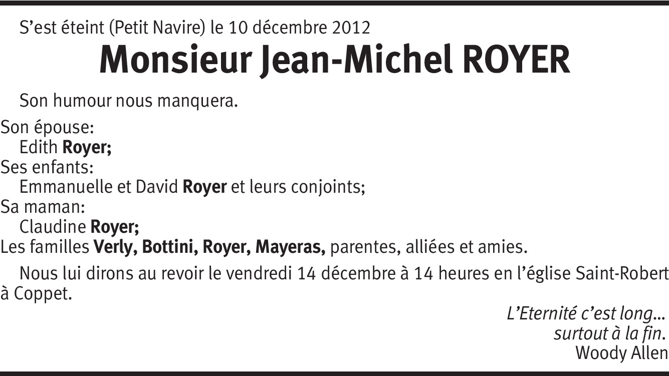 C'est avec tristesse que j'ai appris le décès de Jean-Michel. Je vous adresse mes plus sincères condoléances. Que ces quelques mots puissent vous apporter à vous famille le réconfort en ces moments douloureux, je peux vous assurer que sa mémoire restera à jamais gravée dans mon coeur. L'absence reste l'absence, les souvenirs demeurent ; ils nous aident à reprendre courage. Il me reste les bons moments que nous avons passés ensemble au CVD, c'était un personnage. le malheur de l'avoir perdu ne doit pas nous faire oublier le bonheur de l'avoir connu. Didier Barraud, Ancien Président de la Commission des employés ATI STELLRAM