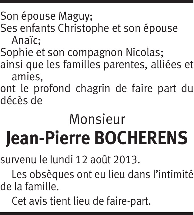 J'ai appris tout récemment, avec tristesse, le décès de mon ancien maître d'école... Monsieur Jean-Pierre Bocherens était mon instituteur alors que j’étais en 5e année primaire à l’école des Tattes (1968-1969). Je garde de lui un excellent souvenir. C’était un homme passionné par son métier. Je me souviens avec émotion de son sourire bienveillant pour nous encourager à l’étude, comme de ses colères, parfois bien justifiées, quand nous faisions des bêtises... Il nous a appris, entre autres, à aimer la littérature. Particulièrement les œuvres du grand C.F. Ramuz... la musique... le chant... Le défilé dans les rues d'Onex en représentant le lycée papillon... Il aimait partager avec émotions ses souvenirs de sa terre vaudoise natale... Je me souviens de la course d’école aux Rasses et de la semaine en classe verte à Montana, inoubliable! Je suis reconnaissant pour tout ce qu’il m’a apporté, pour tout ce qu’il a investi en temps et en énergie pour nous préparer à la vie... et je suis bien triste d’apprendre aujourd’hui son décès... Oui, il reste pour moi quelqu’un qui aimait enseigner et qui, surtout, aimait les enfants que nous étions... Merci, Monsieur Bocherens... merci pour tout! A vous, chère Madame, chère famille, je vous adresse ma profonde sympathie. Que Dieu vous accompagne de sa paix et de sa lumière et garde vos cœurs dans l’espérance. Avec toute mon amitié! Alain Feuz