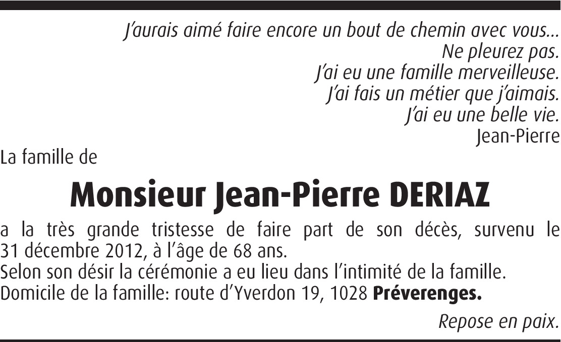 Nous venons d'apprendre la disparitionn de Jean-Pierre et sommes de tout coeur avec vous. Il n'y a pas de mots pour dire notre tristesse et nous nous joignons à votre douleur et témoignons nos sincères condoléances. A.Grossmann, Jean-Bernard et Richard Mehr