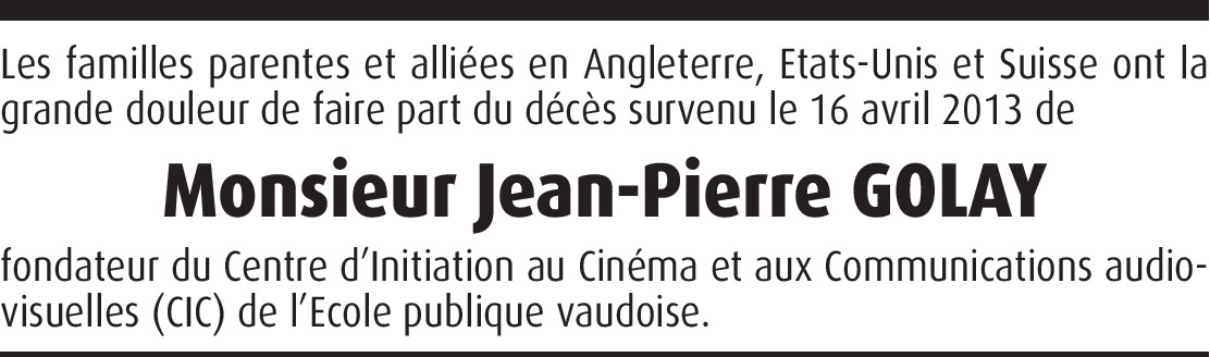 Enseignant secondaire en français et histoire, puis professeur à l’École normale (alors en charge de la formation des enseignants en général), marqué par le pouvoir des nazis à manipuler l'opinion au moyen des médias (la radio surtout, à l’époque), il se dit que les élèves devaient apprendre à décrypter et rester maîtres de leur compréhension des messages véhiculés par les médias, donc qu'il fallait enseigner les compétences idoines comme pour les autres disciplines. Et que les élèves, pour comprendre les médias, devaient les pratiquer en faisant eux-mêmes films, reportages, interviews. Il fonda alors en 1967 le CIC / Centre d’Initiation au Cinéma, qui devint rapidement le Centre d’Initiation aux Communications de masse et aux moyens audio-visuels, et fit partie intégrante du DIP / Département de l’Instruction Publique devenu le DFJ. Disposant d’un puissant service de prêts de caméras (du 8 mm des débuts au caméscope) et d’enregistreurs (de la cassette ou bande magnétique au numérique), de studios d’enregistrement et TV fréquentés tant par les enseignants que par les élèves, le CIC fut grâce à son fondateur un Pionnier mondial de l’enseignement critique à l’endroit des médias en faisant comprendre leur fonctionnement par leur pratique. Cette conception bien différente de l’enseignement traditionnel frontal perturba plus d’un enseignant. Mais cette démarche reçut le soutien du secrétaire général du DIP de l’époque André Mottaz, ainsi que du DFJP (dirigé alors par Kurt Furgler). Jean-Pierre Golay était l'ami de personnalités vaudoises connues parmi lesquelles - Robert Gerbex, ancien secrétaire général adjoint du DIP, fondateur de la TV éducative, Bertand Lipp, instigateur de la réforme de l'enseignement du français, et Pierre Gisling, co-fondateur de la TV éducative et instigateur des camps de dessins des écoles secondaires, Dès 1979 et pendant une année et demie, Jean-Pierre Golay induisit aux USA des projets de recherche en mass médias, notamment à l’Université du Wisconsin à Madison (UW). En 1988, il prit sa retraite et quitta définitivement la Suisse et son poste de directeur du CIC à Lausanne pour s’adonner, dans le cadre de l’Université du Wisconsin, à la recherche sur les médias et leurs relations avec l’école et la formation de l’opinion publique. Encore à présent, sa notoriété dans ce domaine dépasse largement les frontières des États-Unis. Cette pédagogie des mass médias consistant à pratiquer une chose pour comprendre une chose inspira la réforme du français incarnée par Bertrand Lipp (« Maîtrise du français », dès 1972). Cependant l'optique que les élèves acquièrent un sens critique développé en matière de médias et de pouvoir ne plut guère à la partie conservatrice de l'opinion publique du canton de Vaud. Jean-Pierre Golay étant émigré depuis plusieurs années à Madison, le CIC perdit son statut d'institut et devint un simple composant de la HEP / Haute École Pédagogique de Lausanne. Ses activités furent alors très fortement réduites. Blaise Golay