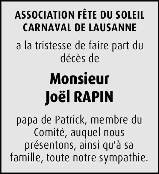 Il y a plus de 4 ans Signaler Mes sincères condoléances. j' ai connu Mr Rapin ainsi que la famille je suis une ancienne Payernoise. Une tristesse pour la famille. Mes meilleures salutations. Paola. De la part de Paola Chassot