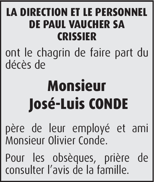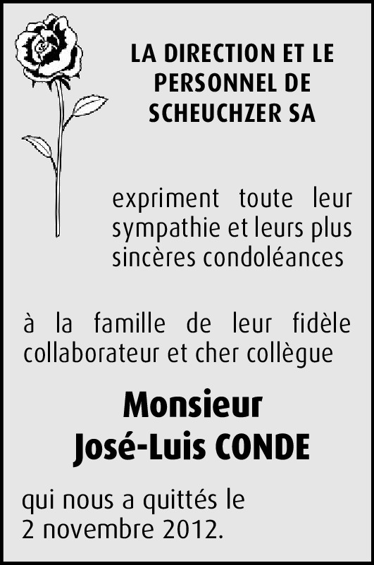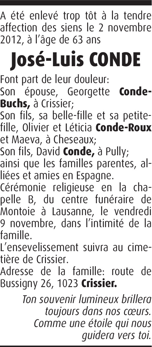 Il y a plus de 4 ans Signaler Nos sincères condoléances pour la famille Conde de la part de la famille Castro Olivares. Jose fuiste un buen Hombre en esta vida, gracias. De la part de Victor Castro