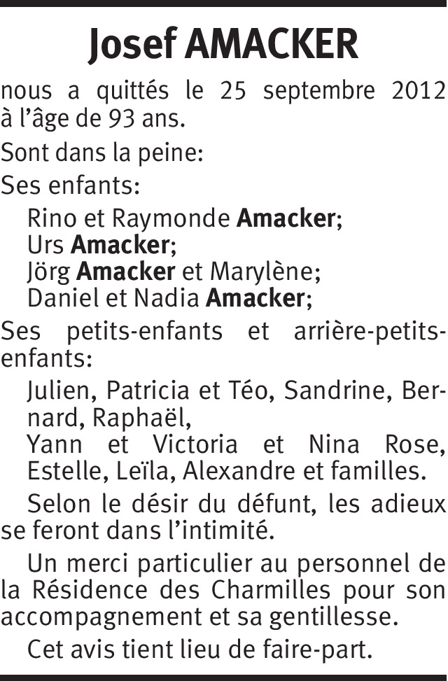 Il y a plus de 4 ans Signaler Toutes mes sincères condoléances à Monsieur et Madame Rino Amacker. Paula Vité De la part de Paula Vité- Bleichenbacher