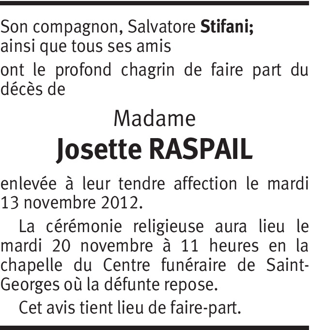 Irène Parisi ( une patiente )a qui elle m'a fait beaucoup de bien, et ma ouverts les yeux, merci mille fois. Repose en paix Josette.