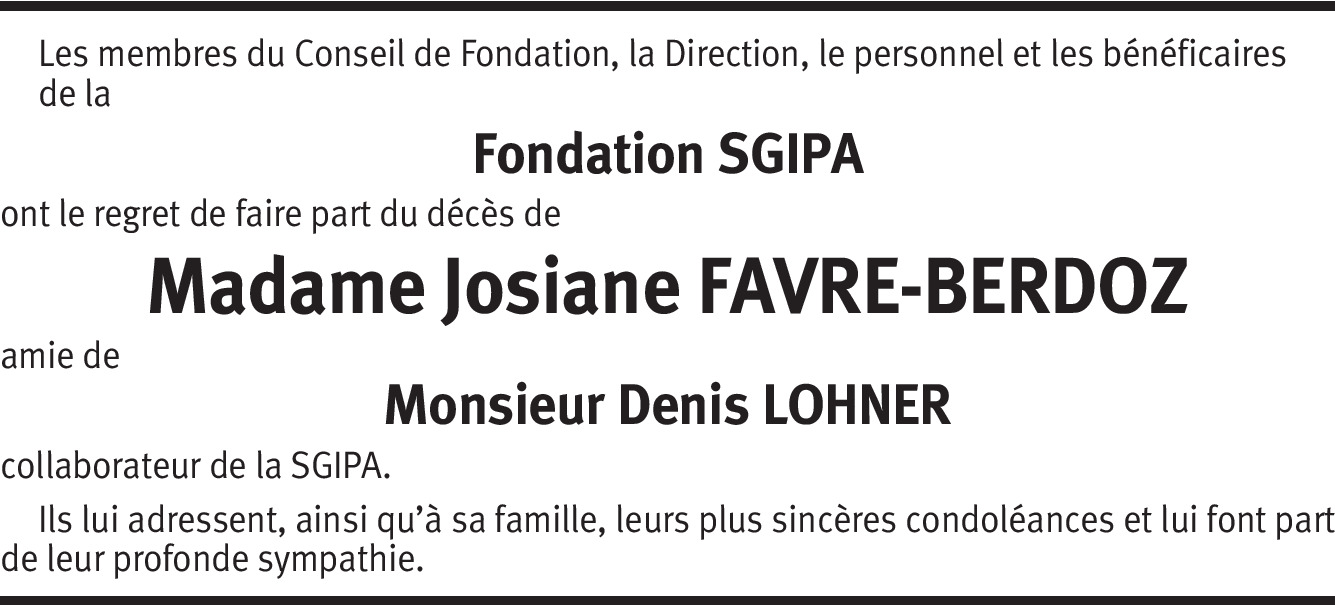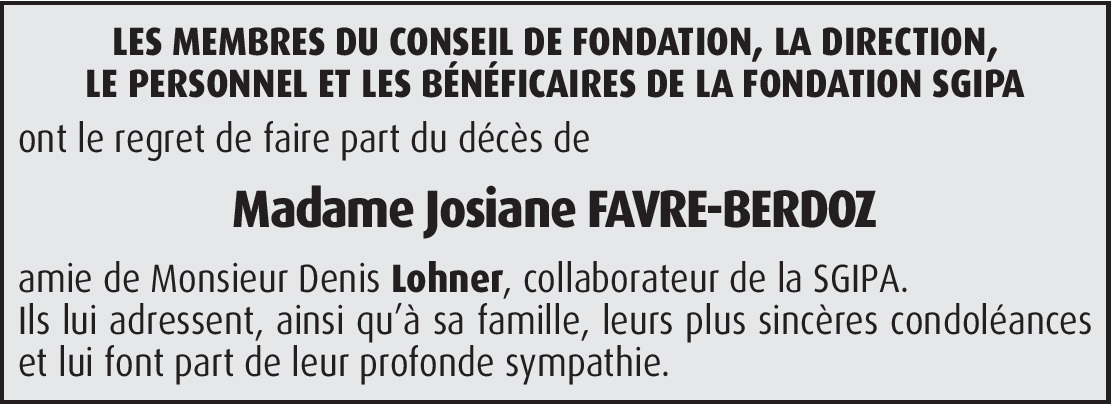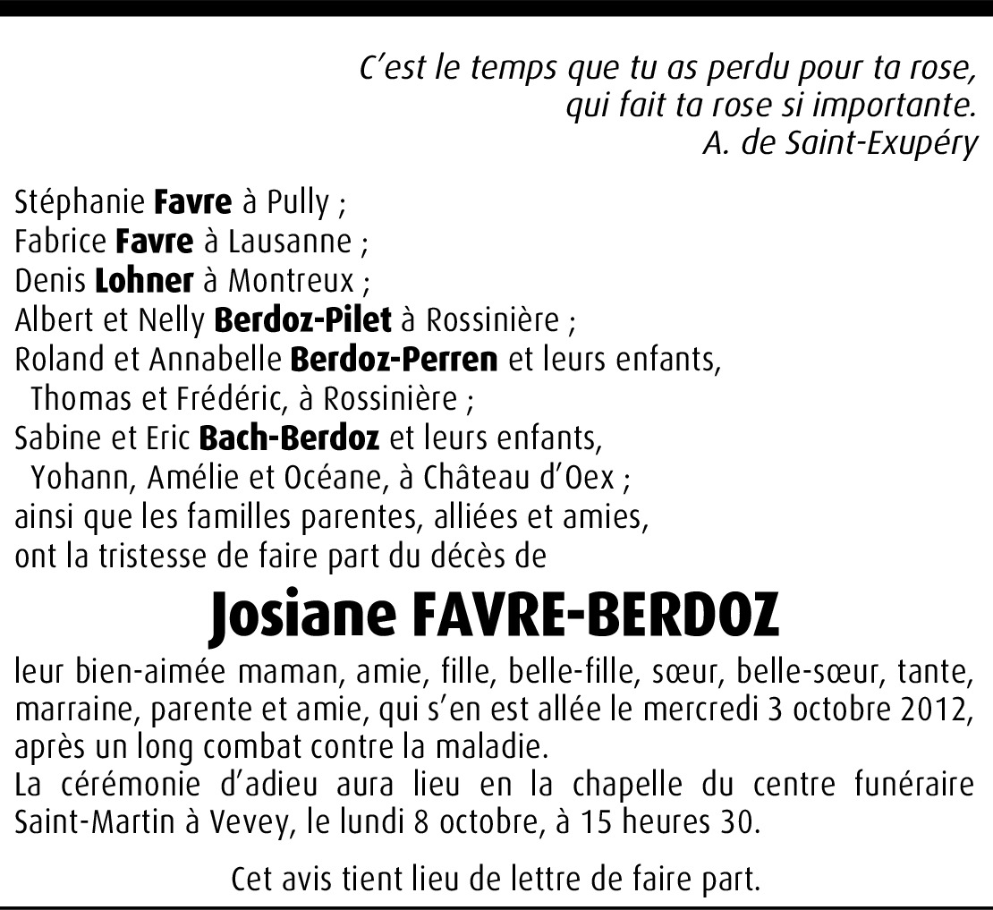 Chers enfants et amis, je ne vous connais pas mais votre maman était notre filleul. Son parrain est décédé le 18 juin 2001 à l'âge de 65 ans. Pour moi, tout a beaucoup changé, j'ai du partir de Rossinière. La vie nous a spéparés mais les pensées sont restées. Je pense beaucoup à vous et vous dis courage. Bien à vous. Sa marraine Babette.