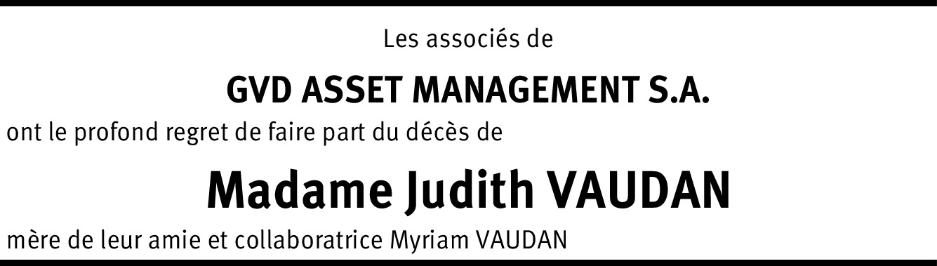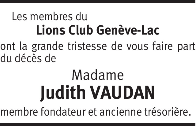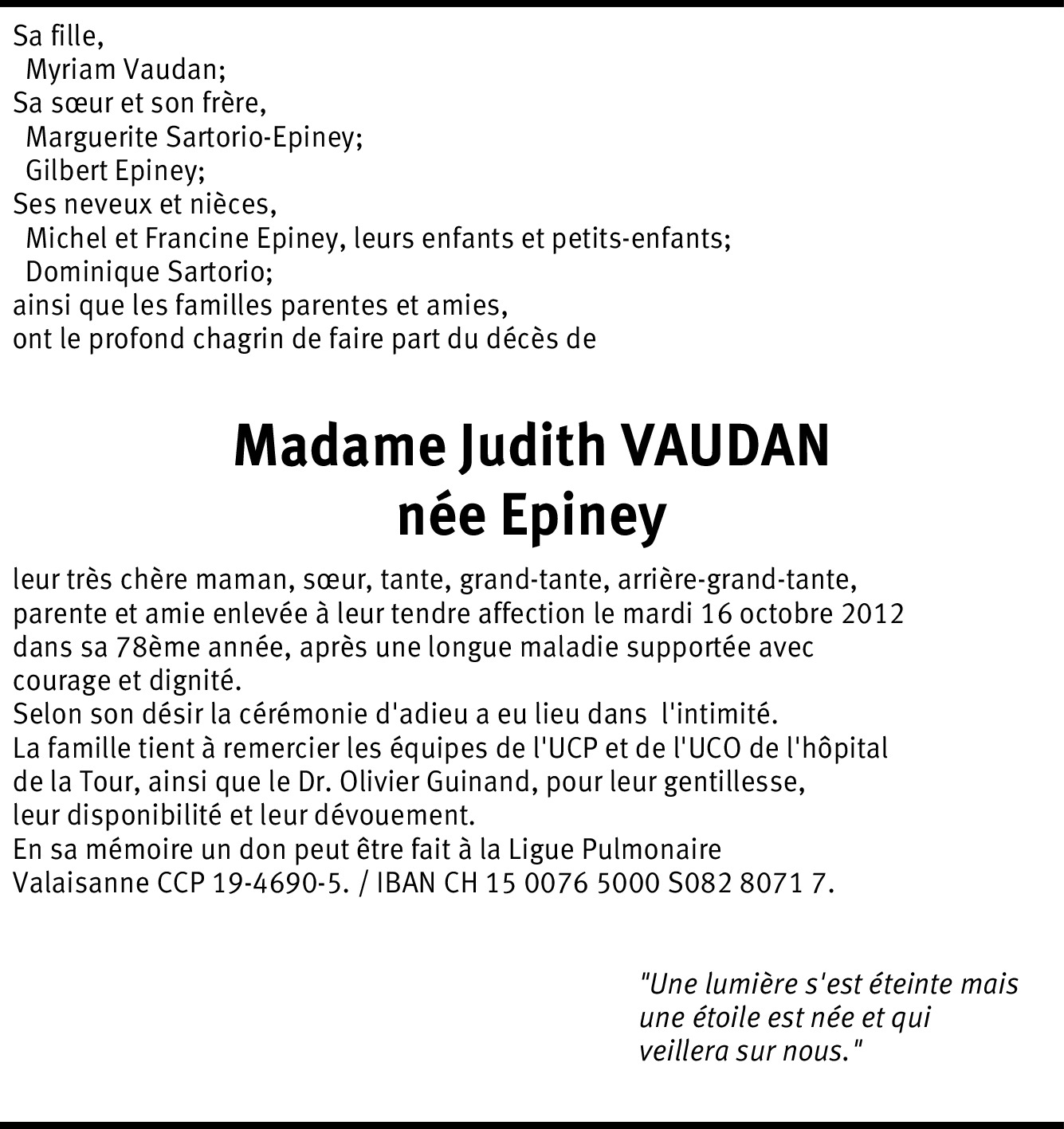 Il y a plus de 4 ans Signaler Je vous prie de croire à mes très sincères condoléances. J'ai cotoyé dans les années 1973-1976 Judith Vaudan à l'agence SBS de Cornavin et ai gardé un excellent souvenir de cette collègue De la part de Jean-philippe Perret