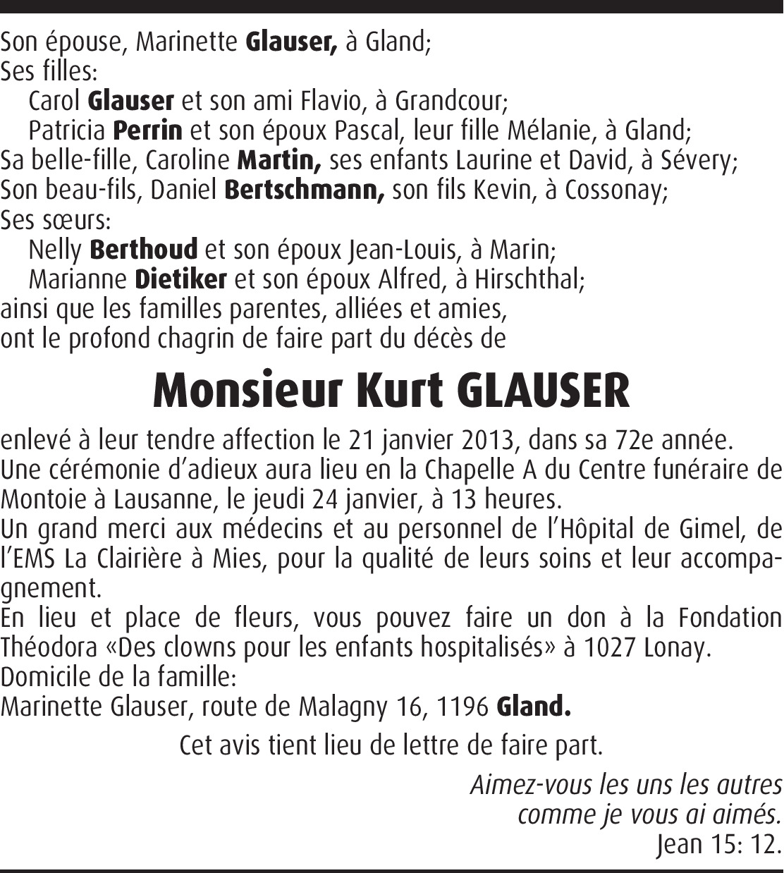 Un respectueux salut militaire à toi Capitaine Kurt GLAUSER. Je n'ai pas eu la chance servir sous ton commandement, étant trop jeune du haut de mes 40 ans, contrairement à mon père que tu as eu sous tes ordres. Il me restera de toi, Kurt, l'image d'un homme droit incarnant parfaitement les valeurs qui étaient les tiennes. Tu vas nous manquer profondément. Tu es comme ce peuplier planté au côté de ses pairs que l'on vient de couper, tu laisse un vide immense que rien ne pourra combler. Mes pensées vont à ta famille, Marinette, Daniel, Caroline, Carol, Patricia et tous les autres... Mon capitaine, Garde-à-vous... Repos... Rompez... Repose en paix, tu l'as bien méritez. Toutes la famille Humbert-Droz, David, Corinne, Adrien et Diane.