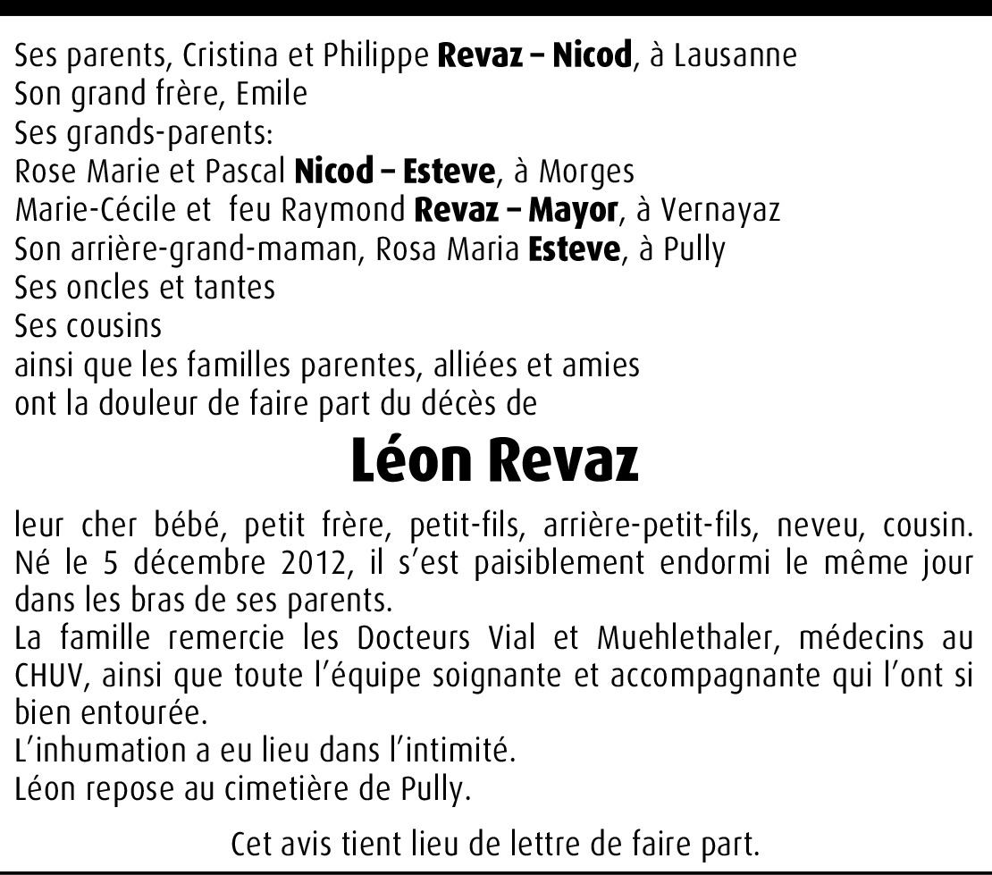 C'est par hasard que je vois votre faire-part de décès pour votre petit garçon. J'ai moi-même perdu mon petit garçon le 19 décembre 2010, aussi au CHUV, le lendemain de sa naissance. Je tiens à vous envoyer toute ma sympathie ainsi que mes pensées les plus chaleureuses. J'allume une bougie pour votre petit ange qui désormais veille sur vous.