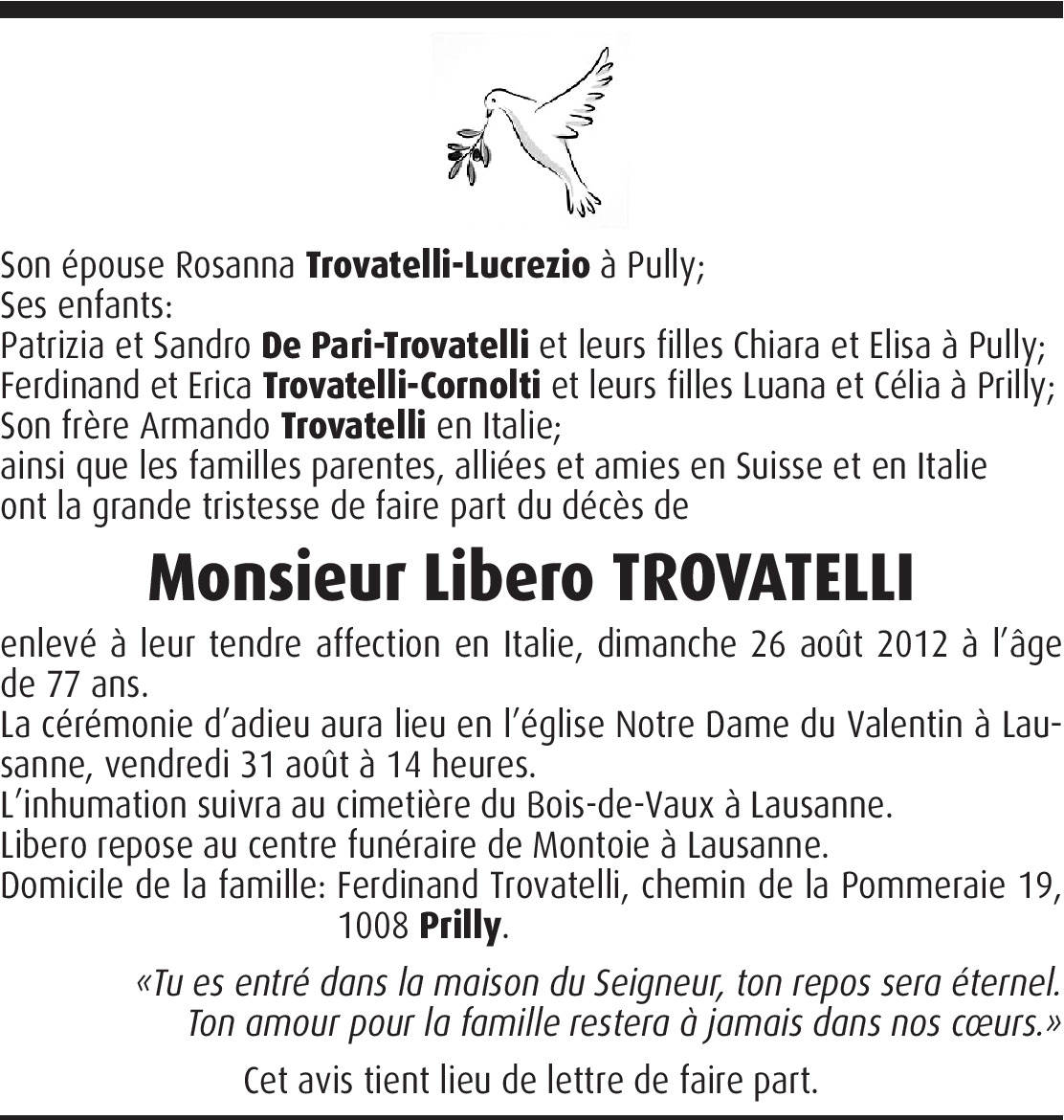 Il y a plus de 4 ans Signaler Nous sommes de tout coeur avec vous, sincères condoléances. Courage. Esthel et Sandro Carletta De la part de Sandro Carletta