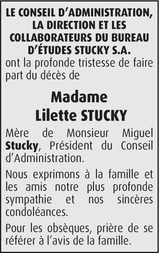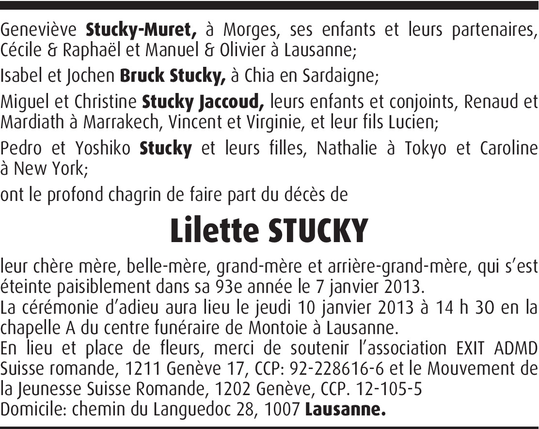 Il y a plus de 4 ans Signaler Ton amour de la vie et ton enthousiasme étaient contagieux. Merci Lilette. Quel bonheur pour tes proches que tu sois partie dans la sérénité ! L'amie d'Inner Wheel Lausanne. Jeanine Stettler. De la part de Jeanine Stettler Burnand