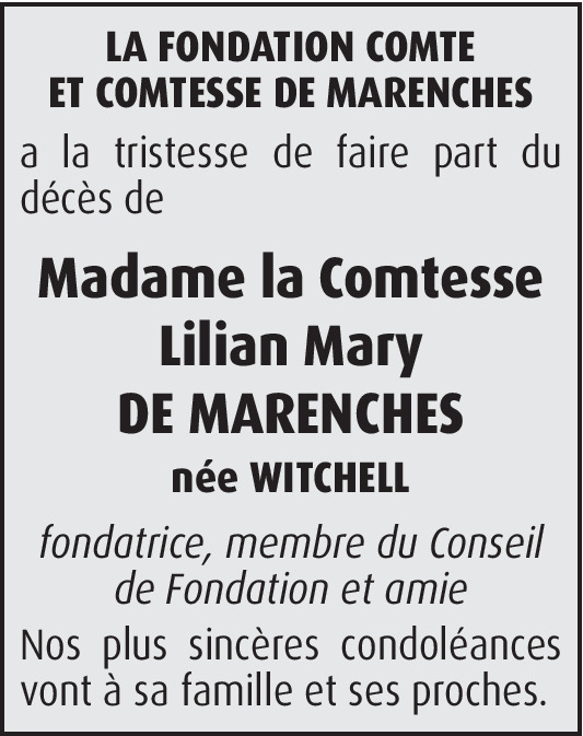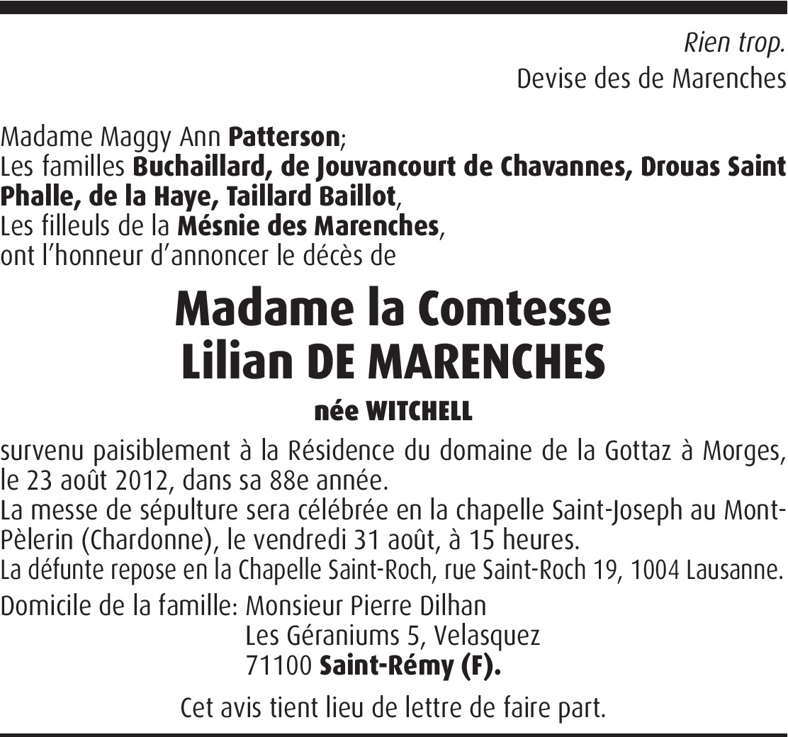 C'est avec grande tristesse que j'apprends le décès de ma Tante Lilian qui restera le lien avec mon Oncle Alexandre. Ce souvenir d'une grande Dame courageuse et admirable. Avec Oncle Alexandre, Tante Lilian reste et restera un exemple pour toute les générations avec sa grande force de caractère. Ma petite famille se joint à moi pour embrasser Tante Lilian qui a rejoint Oncle Alexandre et Anselme auprès de notre Seigneur. Nous vous embrassons bien fort. Anselme, Virginie, Charles et Clémence de La Rochefoucauld (Neveu, Nièce, Petits neveus et membre de la Mesnie)