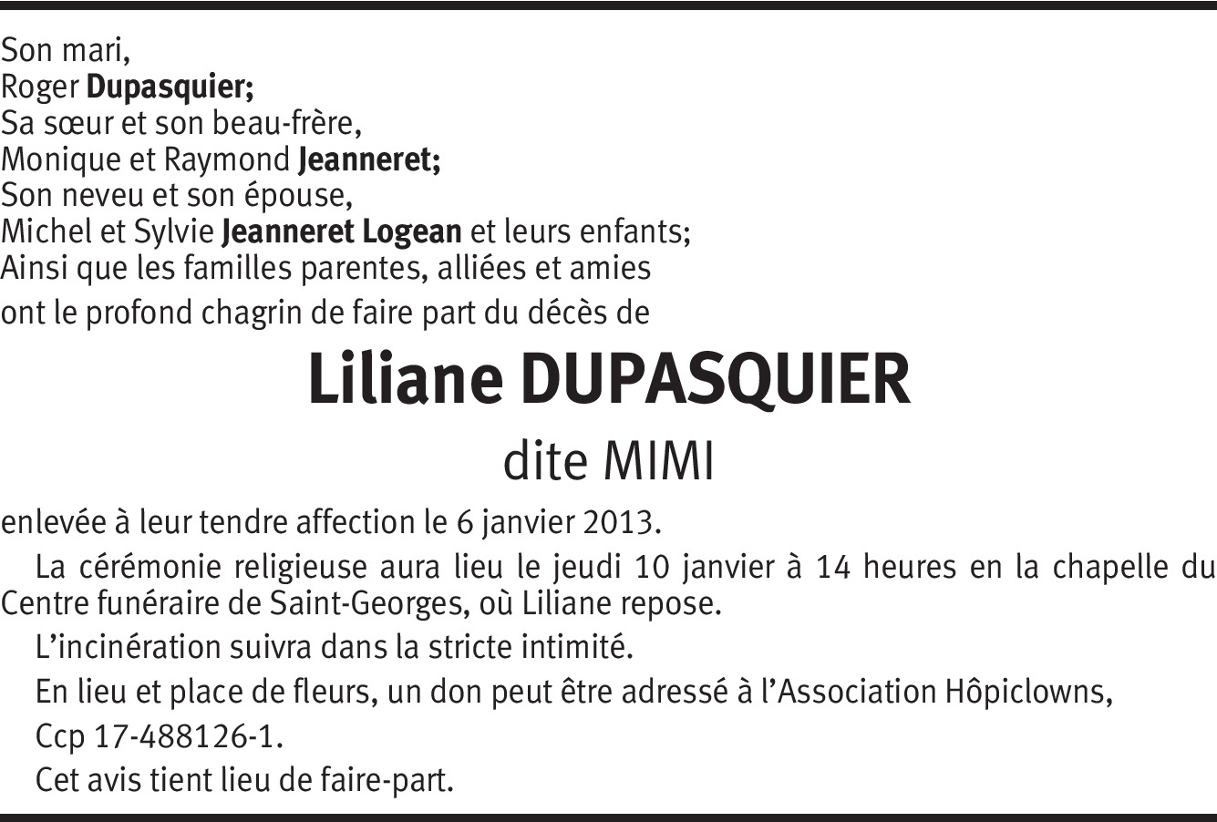 Au revoir petite Liliane, je garderai un souvenir particulier vous qui m'avez suivie en apprentissage et appris tellement de choses. A votre époux, votre soeur Monique mes amicales pensées.