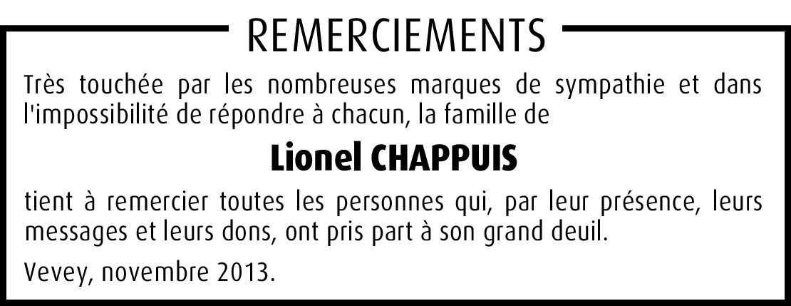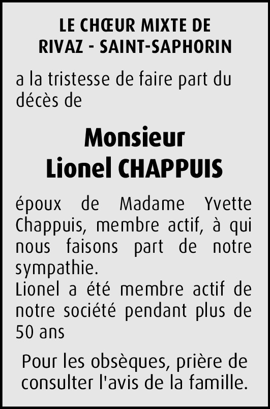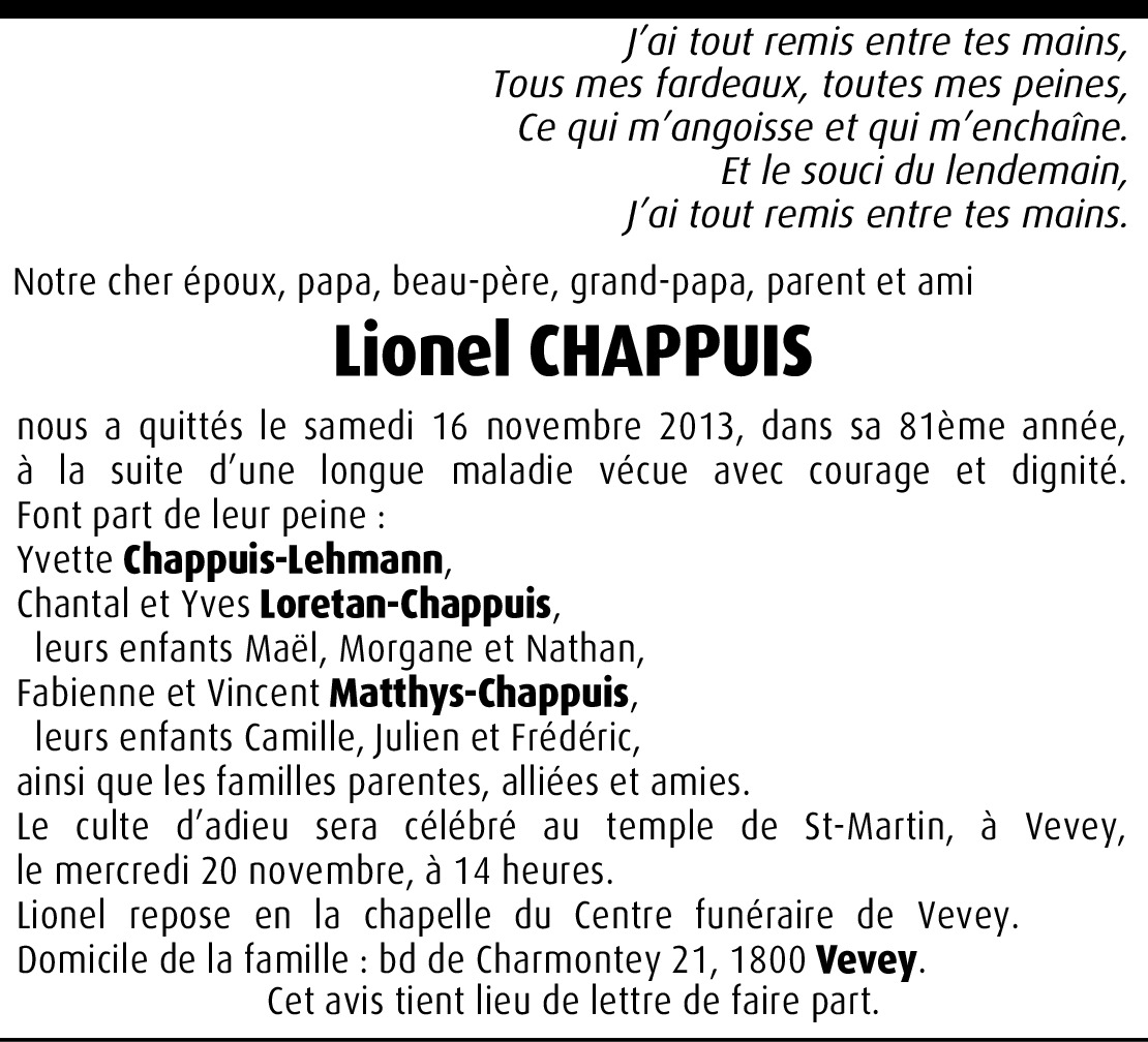 tristesse le décès de Lionel, dans l'impossibilité d'être parmi vous en ces instants difficiles, je vous adresse mes sincères condoléances et reste en pensée avec vous. R. Bettex