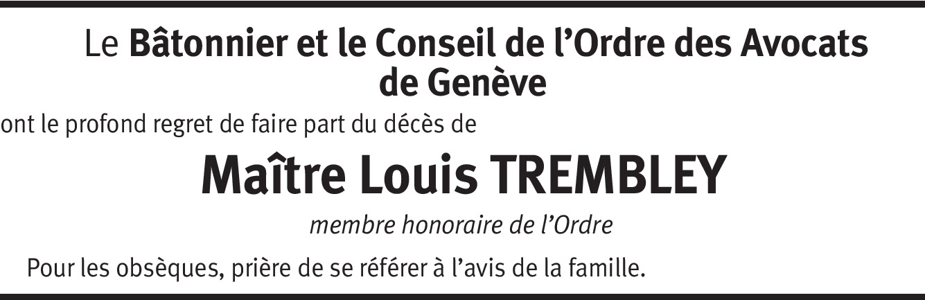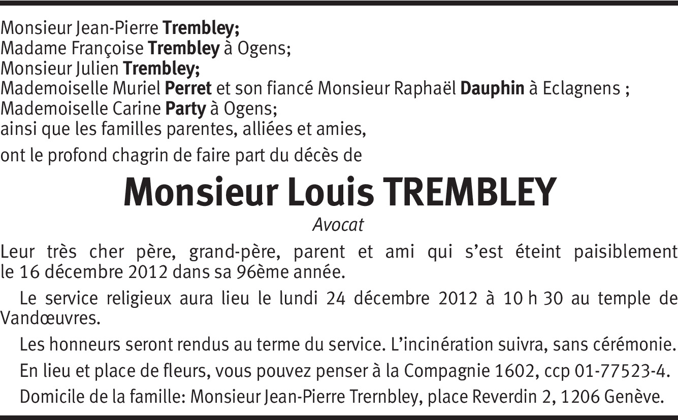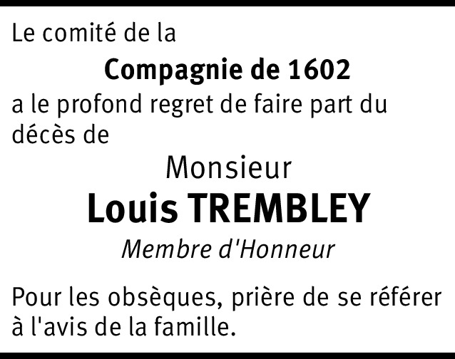 J'avais eu l'occasion de rencontrer Monsieur Trembley lors du banquet des 20 coups de l'Arquebuse en compagnie de mon père et de mon frère Gilbert. J'en garde un excellent souvenir.