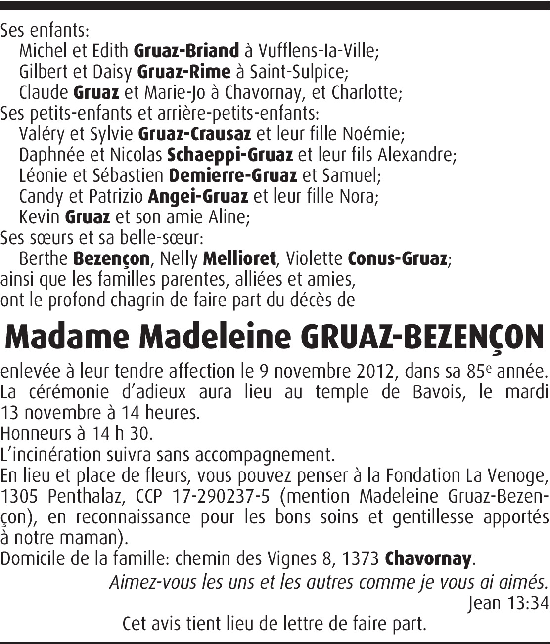 A Claude Gruaz, Je suis en pensée avec vous et votre famille dans votre épreuve. Je vous prie de croire à ma sincère sympathie. Elisabeth Meystre.