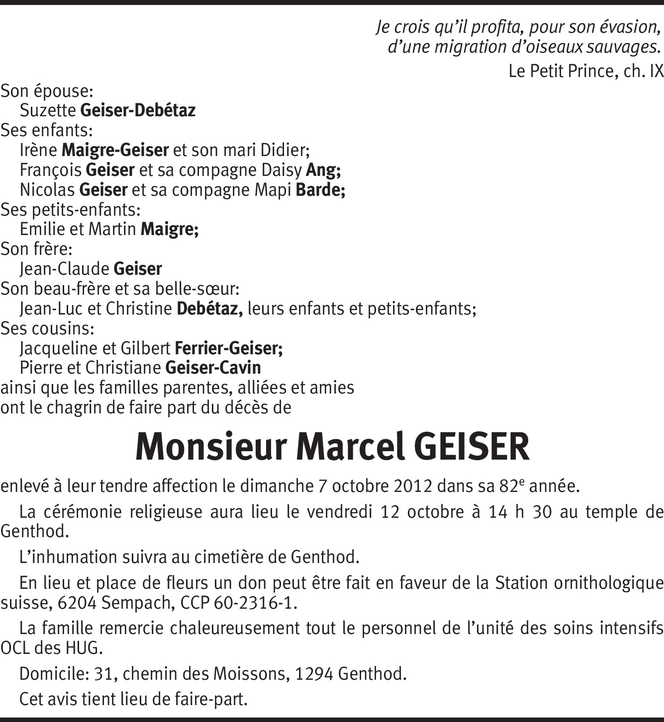 Sending compassion and sympathy at the news of Marcel's death. He will be dearly missed. We have been praying for him and his loving family at St. Joseph's Catholic Church in Ellsworth, Maine. At the request and caring of a close and caring neighbor in beautiful Genthod.
