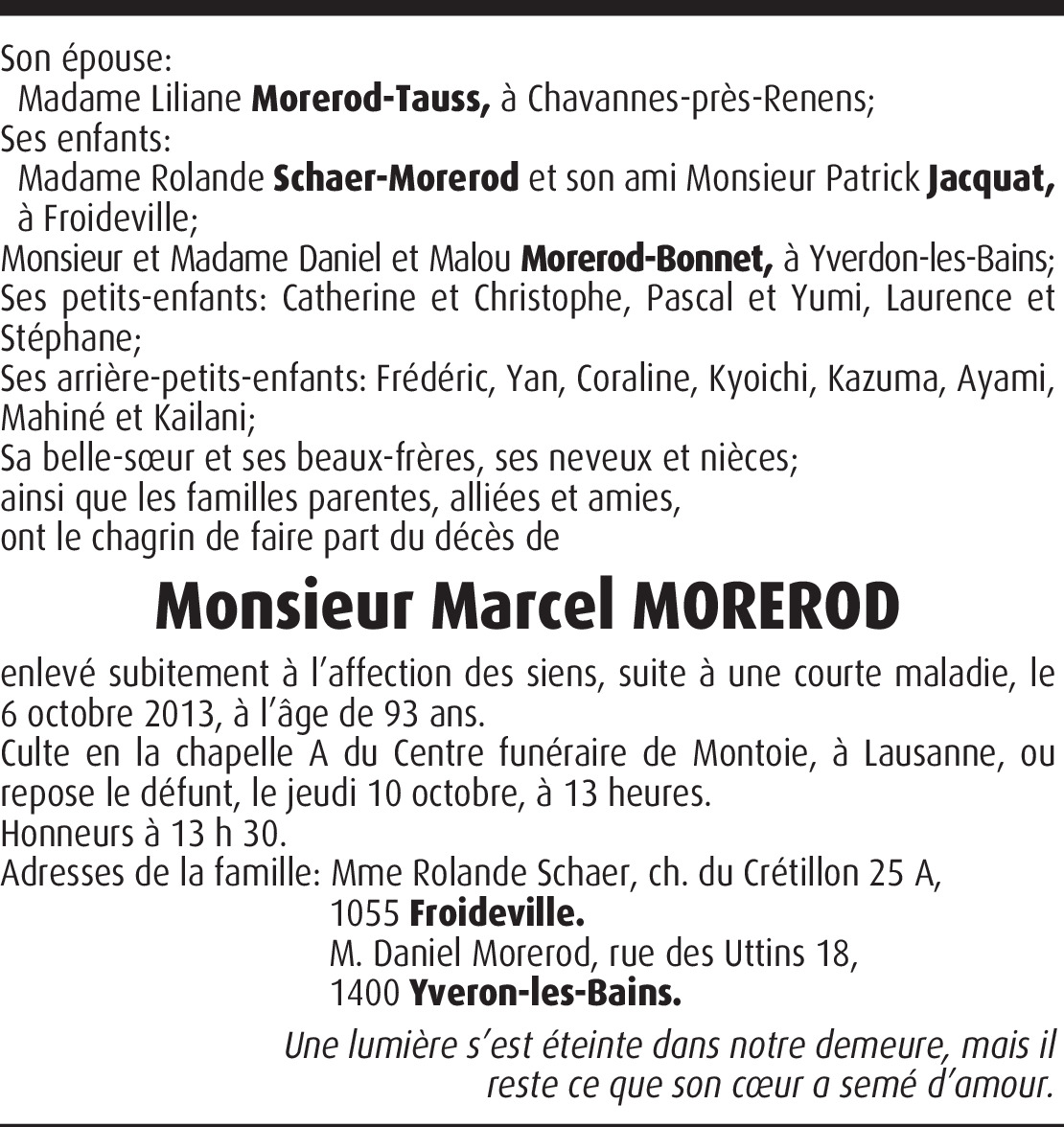 Il y a plus de 4 ans Signaler Je suis navré pour la famille Morerod d'avoir perdu un être cher. Je vous écrit, car je connais LILIANE MOREROD, qui se trouve dans mon collège. Toutes mes condoléance. Nathan Catenne De la part de