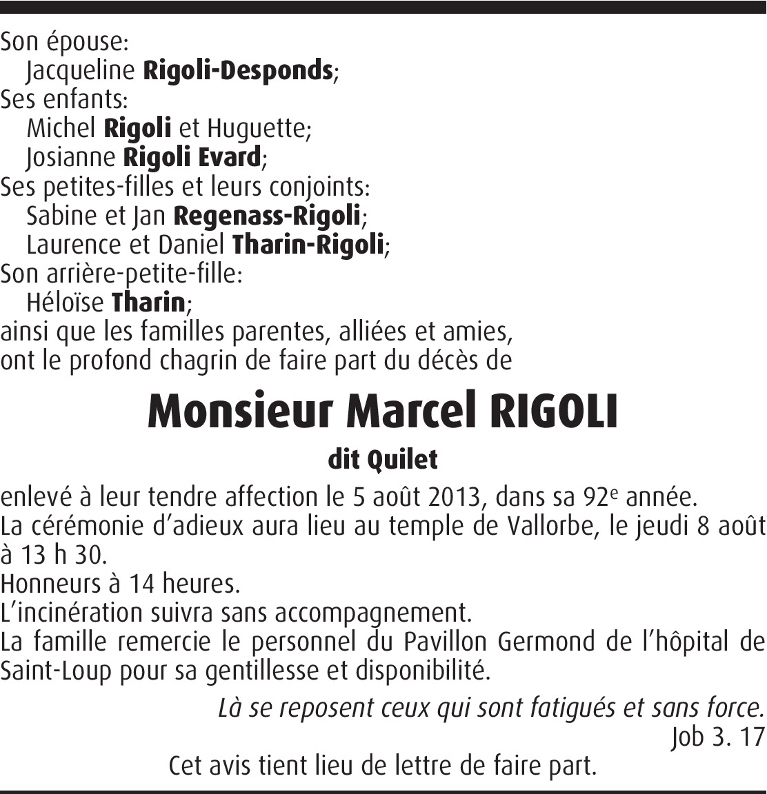 Il y a plus de 4 ans Signaler Chère famille, en ces jours de séparation je vous présente mes Sincères Condoléances .De tout cœur avec vous tous. Claire-Lise Dupertuis De la part de Claire-Lise Dupertuis