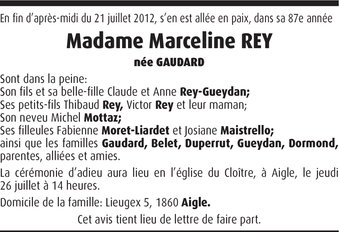 Il y a plus de 4 ans Signaler Sincères condoléances à toute la famille de Mme Rey de la part du Président du Comité de Jumelage de L'AIGLE (Normandie) De la part de Denis Morice