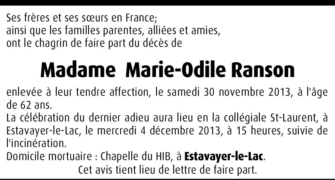 Décembre 2011, quai de la gare à Lille, nous nous retrouvons après 25 ans, on s'est dit toutes les deux: tu n'as pas changé!!!! et on a ri et discuté comme si on s'était quittées la veille. On a refait le trajet de nos 18 ans, pris un café dans le même bar en riant de nos souvenirs de lycée! Je revois en boucle nos fous rires, nos discussions, nos retrouvailles! Mes enfants t'appelaient Magodile! Marie Odile, tu me manques, je t'embrasse, tu seras toujours dans mon cœur. Je ne peux t'accompagner par ma présence, mais je suis avec toi par la pensée. Marie Odile, Merci, et toi seule sait pourquoi. Une vieille amie, Mariette.