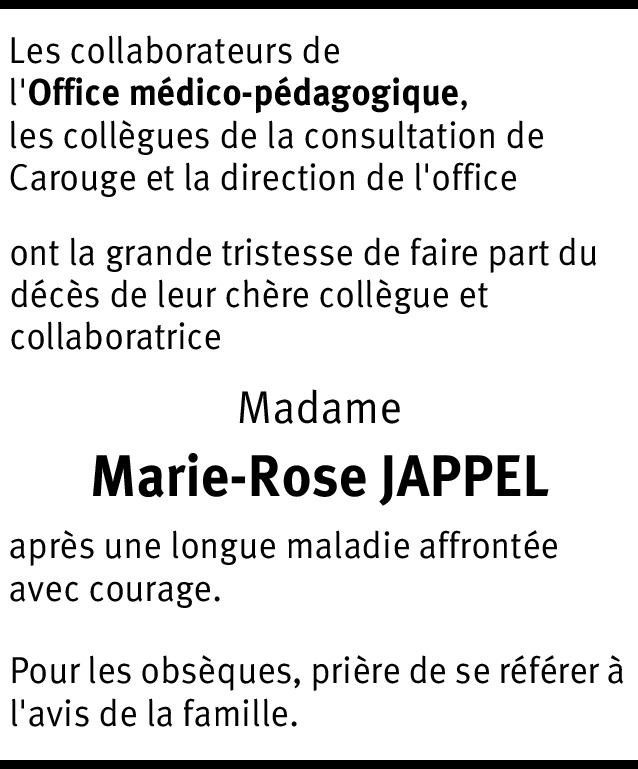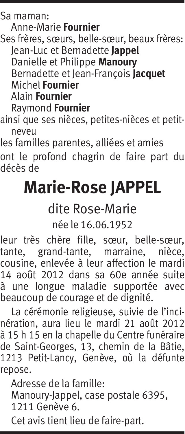J'ai peu connu Rosemarie mais elle a toujours été la pour me faciliter la tâche au travail, cette dernière année j'ai souvent pensé à elle en espérant qu'elle réintègre sa place de travail... Mais elle n'est jamais revenue. Toutes mes condoléances à sa famille.