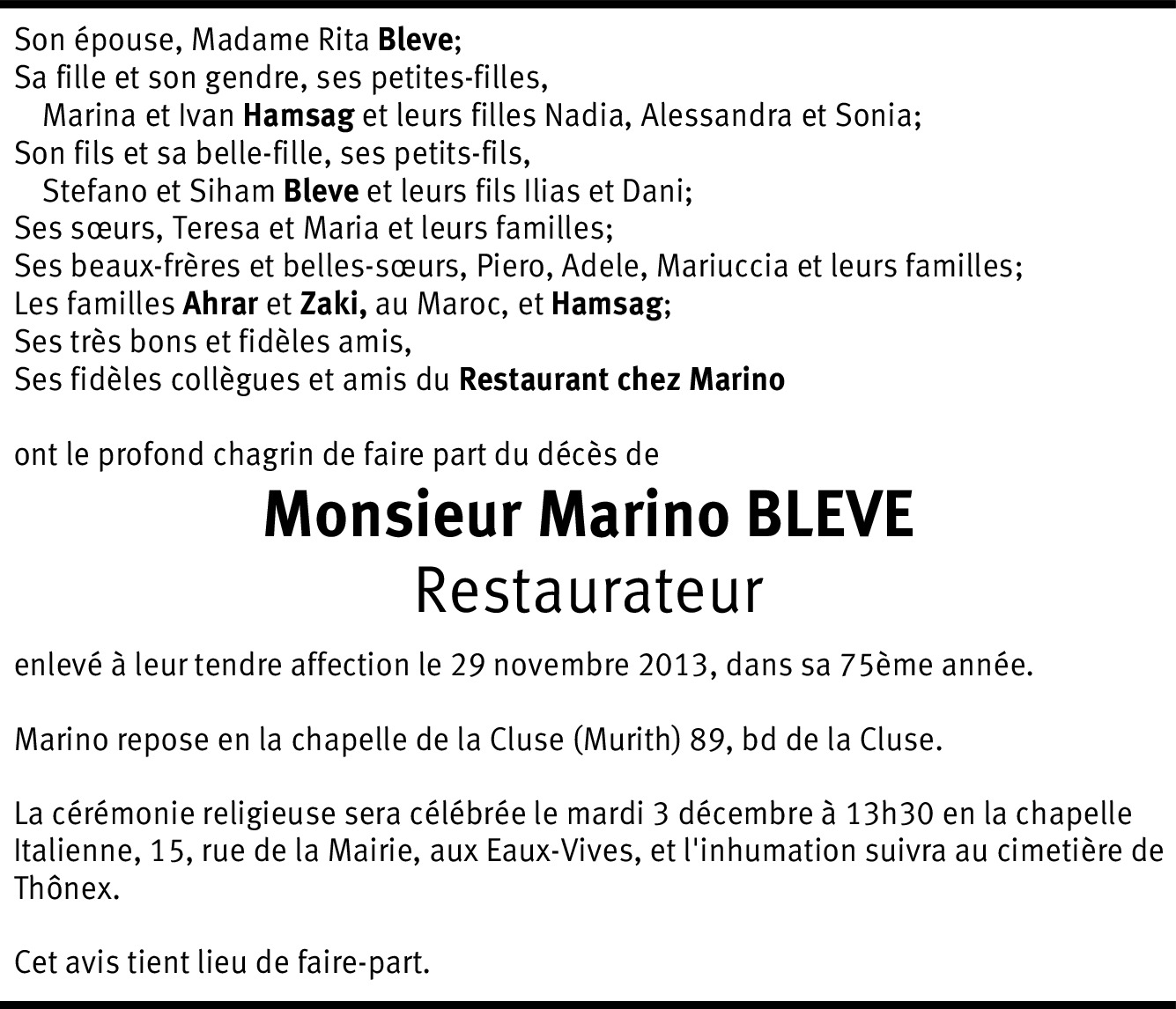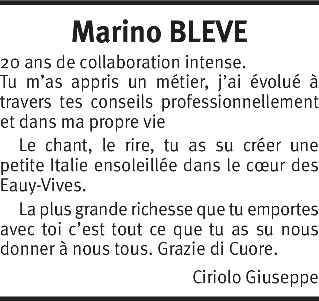 Il y a plus de 4 ans Signaler De la part de l'équipe du Mardi; nous garderons un souvenir lumineux de Marino, généreux commerçant et chanteur hors pair. Sincères condoléances. De la part de Laurent Loup