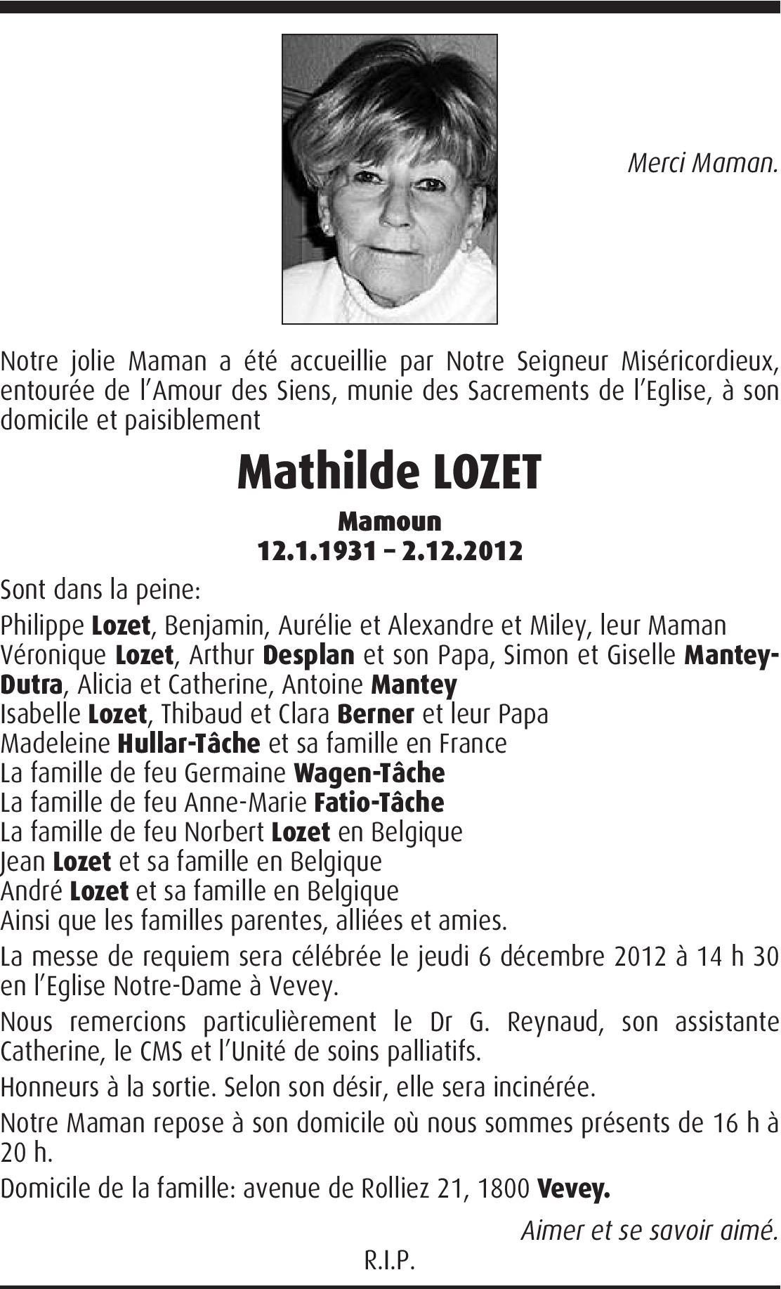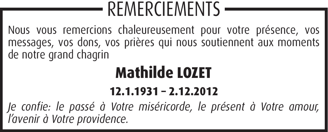 C'est avec beaucoup de tristesse que j'ai appris que je n'entendrais plus le rire franc et chaleureux de Tante Mathilde. Ses yeux pétillants de charme et de malice, ces bons mots et sa joie de vivre vont me manquer. Avec elle, s’éteint une partie de mon enfance. Je garderais précieux, le souvenir de son sourire et des bonnes parties de cartes avec "les tantes" dans le jardin. Merci pour sa chaleur lorsqu'elle a accueilli Christophe et ses garçons, et sa grâce lorsqu'elle m'a félicité pour ma jolie Camille. Je vous présente nos condoléances et vous envois mes sincères pensées d'affections dans ces douloureux moments "d'au-revoir". Nathalie Hullar; Christophe Barnard & ses fils, Camille Hullar-Bernard.