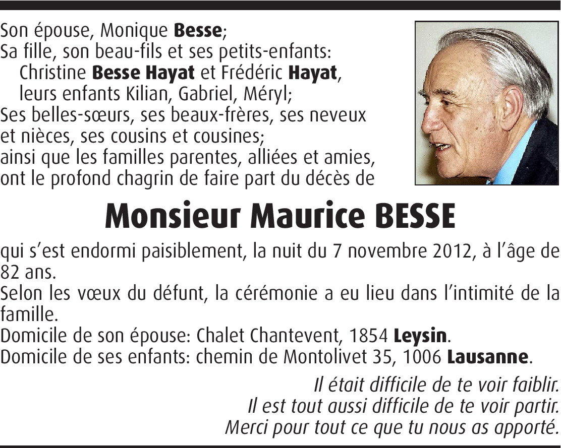 Il y a plus de 4 ans Signaler Je transmets mes condoléances à toute la Famille de Monsieur M. Besse; mon ancien Cap.Cdt. du Bat rav 2 lors de mes premiers CR dès 1969. Plt auto Hofstetter J-J. De la part de Jean-Jacques Hofstetter