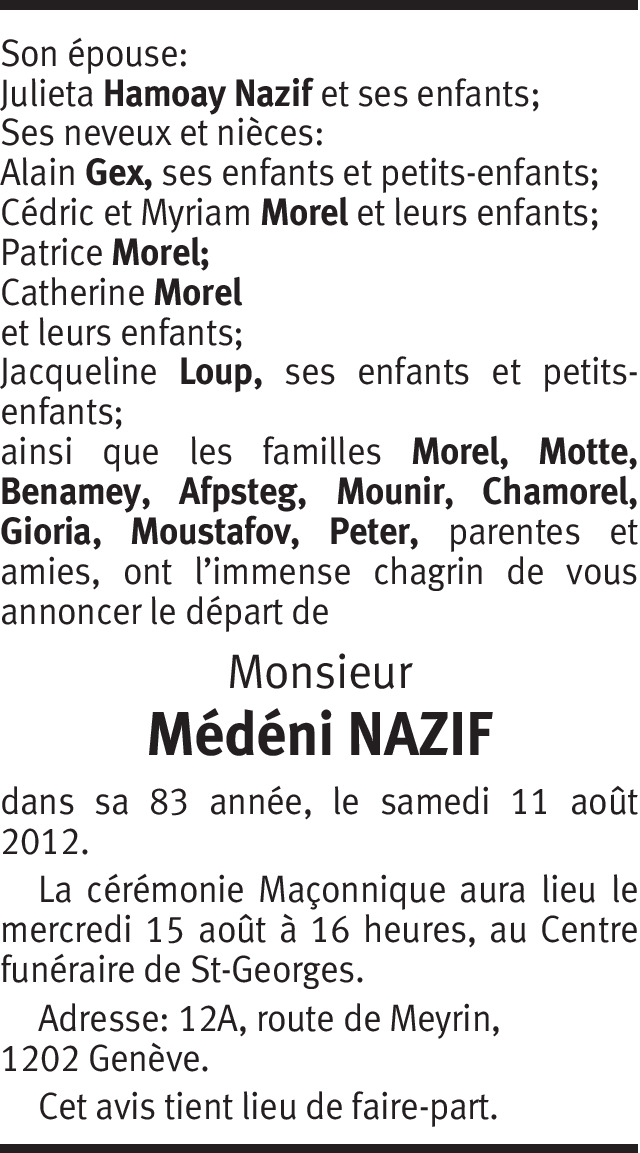 Je suis un ancien copain de jeu de Médéni ayant habité, tout comme lui, rue du 31 Décembre 52 à Genève. Il y a 3 jours je me suis réveillé en me disant que je devrais voir s'il habite toujours Genève et lui téléphoner.... J'ai raté le coche mais me brancherai sur lui autrement. Toute ma sympathie à sa famille que je n'ai pas le plaisir de connaître. Rolf Wahl