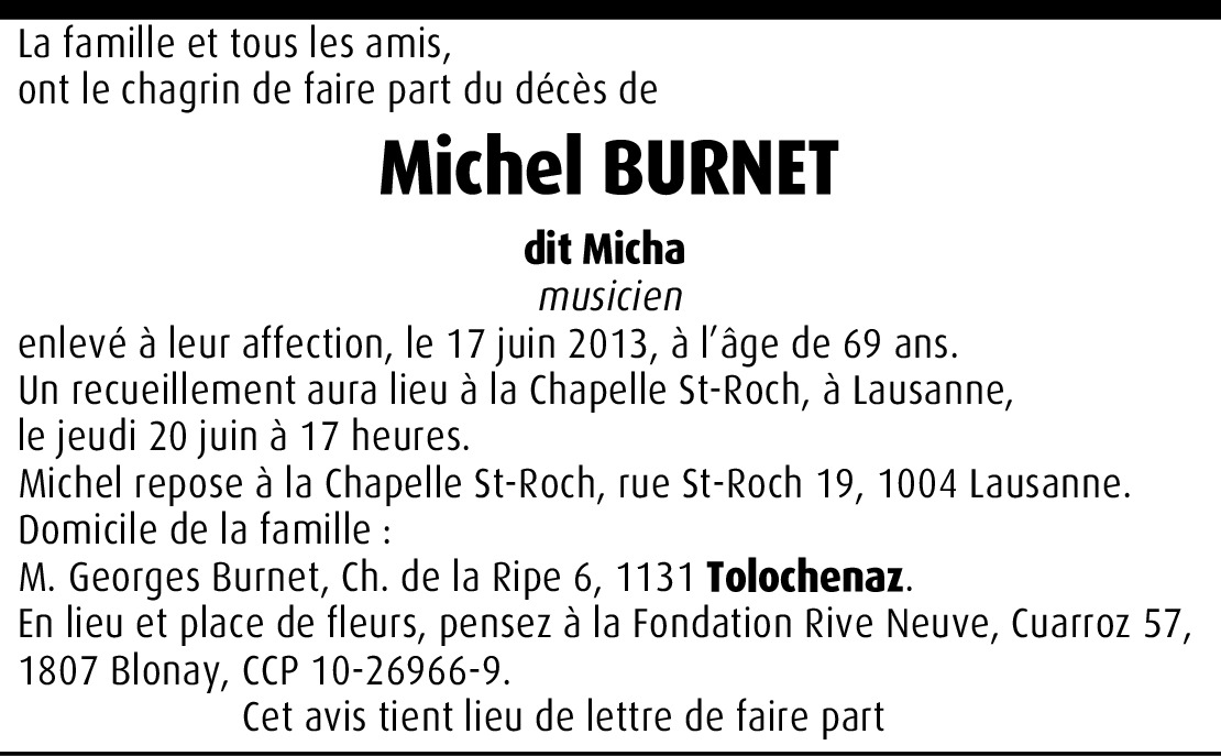 J'ai assisté ce jour à la cérémonie d'"adieu". Toi et ta musique resteront gravées comme le son "Hammond" Merci Micha. Sergio.