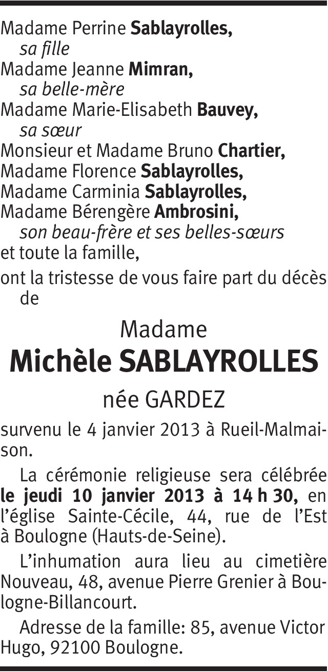Je suis complètement bouleversée par le décés de Michelle que j'essayai de joindre pour l'inviter à mon anniversaire. Que sa fille Perrine m'appelle le plus rapidement possible, je n'ai pas réussi à la joindre, ni François.