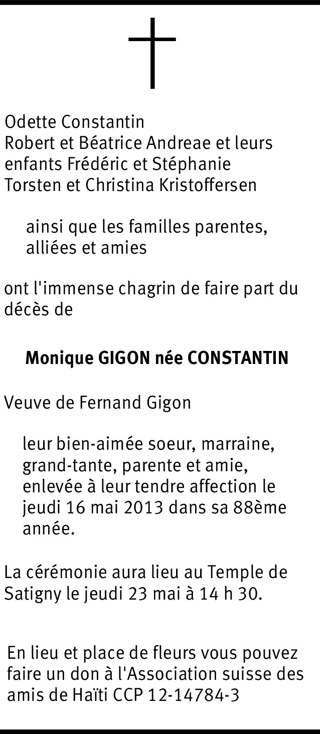 De tout coeur avec vous en ce moment de deuil. J'ai reçu il y a quelques années Madame Gigon au domaine Les Dames de Hautecour plusieurs fois... et je me demandais toujours ce que cette Grande Dame devenait... elle qui avait su illuminer tous les instants passés avec elle, grâce à son énergie, sa bonne humeur,son sens de l'humour, sa joie de vivre! Je me sens honorée d'avoir rencontré une si grande Dame, si moderne, si belle, et me sens toute triste, en la cherchant ce soir, de tomber sur l'avis de son décès, seulement la semaine dernière !!!