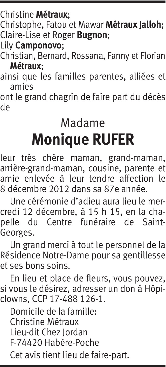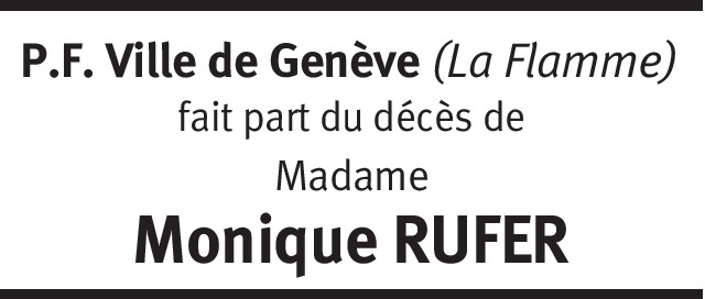 C'est avec une immense tristesse que j'apprends le décès de Monique RUFER que j'ai très bien connue lorsqu'elle venait au Restaurant de la Grappe d'Or du temps de Lucette et Franco. Que de souvenirs lors des belles années de la Grappe d'Or et aussi de merveilleux souvenir lors des 50 ans de mon frère Dominique où elle était assise à côté de son contemporain à savoir mon papa puisque tout les deux était natif de 1926 mon papa du 13 avril et Monique du 13 août au revoir Monique tu nous manques.