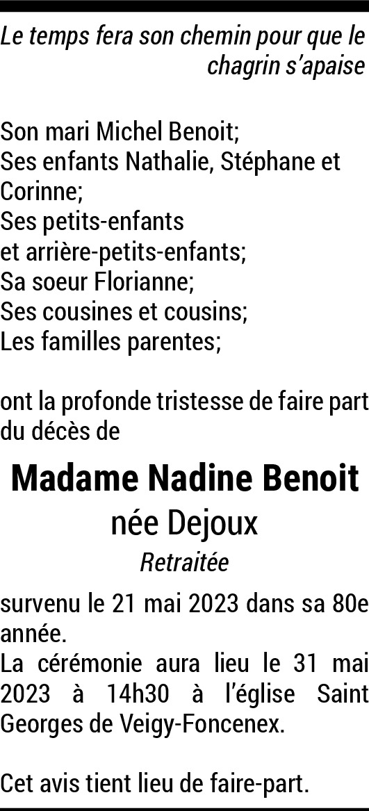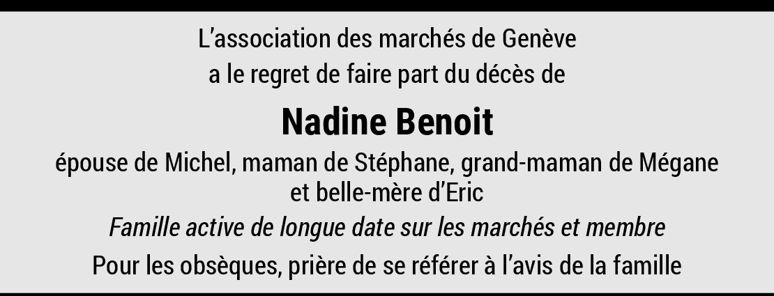 31.05.2023 Signaler Je suis triste et suis en pensée avec votre famille. Nadine avait beaucoup aidé mon épouse lors de la naissance de notre fils Patrick ( à Onex ). Toutes mes condoléances sincères. Pierre Aschiero De la part de Aschiero