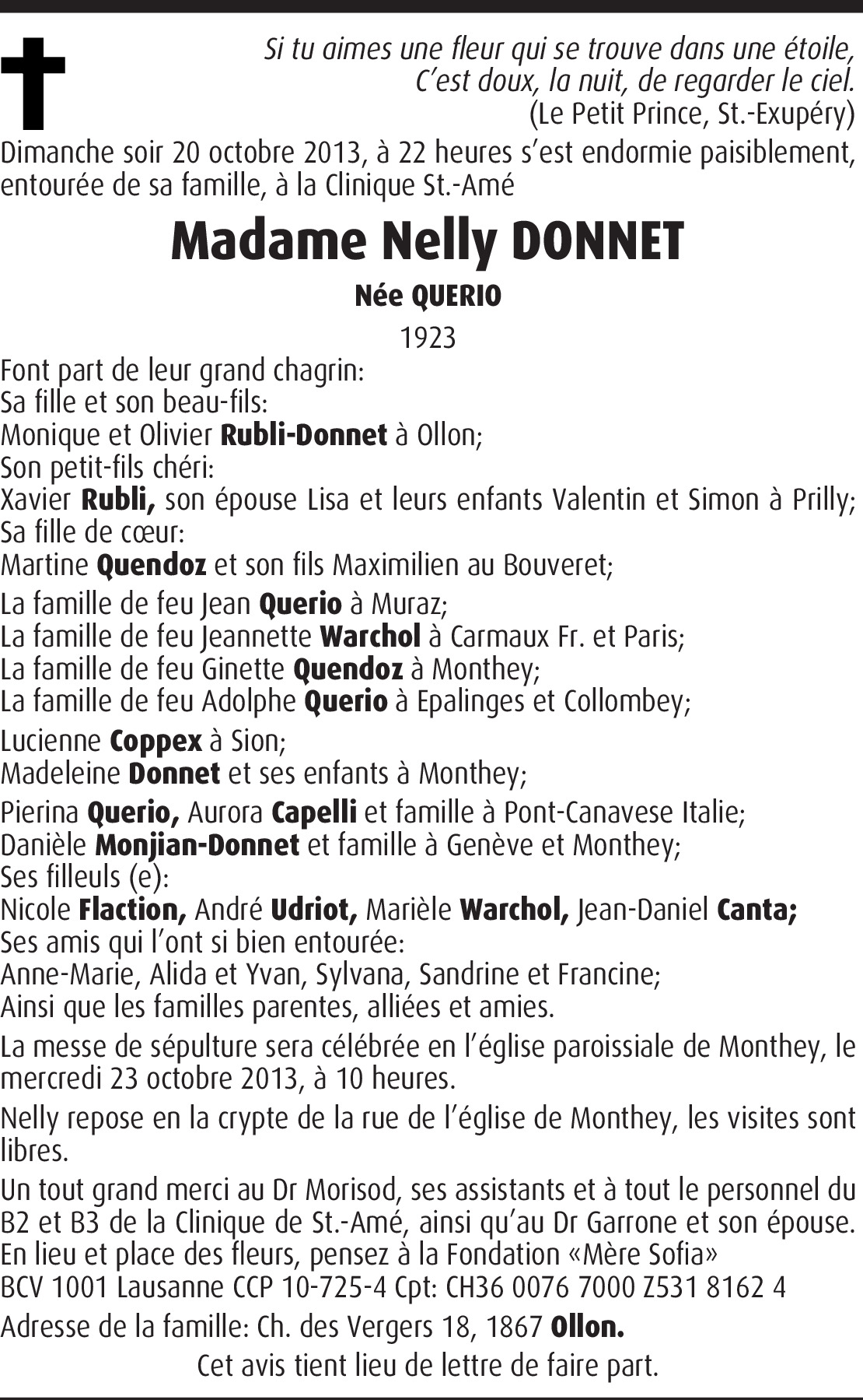 Il y a plus de 4 ans Signaler Je suis très peinée d'apprendre que tante Nelly nous a quittés, j'avais une grande affection pour elle et je ne l'oublierai pas. A toute sa famille j'adresse mes pensées cordiales et sincères Anne-Marie et Jean Sieber. De la part de Anne Marie Sieber