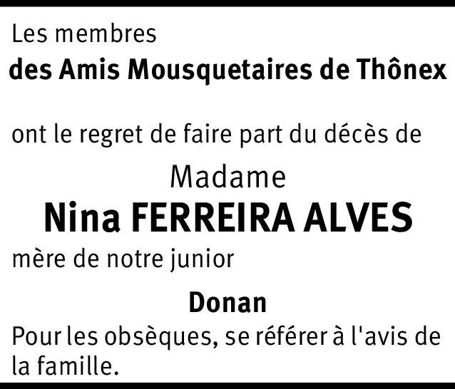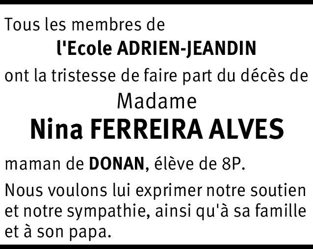 Ma tata chérie... Toi qui étais toujours joyeuse, tu adorais les fêtes (Noël, Halloween...); c'est une injustice du ciel que tu sois partie. Tu es même partie trop tôt. Tu étais une lumière quand les disputes éclataient dans la famille, tu avais toujours les mots pour nous réconforter quand on pleurait. Tu étais une grande partie de nos cœurs et quand tu es partie, ça été le grand vide. Tel un ange, maintenant tu nous surveilles et nous soutiens. Tu seras toujours dans nos cœurs et dans nos esprits. Je ne t'oublierai jamais. Tu me manques énormément. Mon ange gardien, ma Tata Nina... JE T'AIME !!!! <3 Winona Imbault (Ferreira Alves)