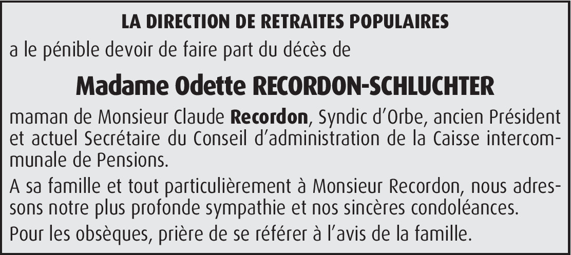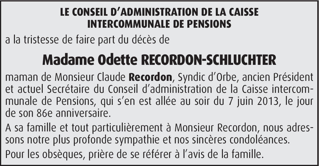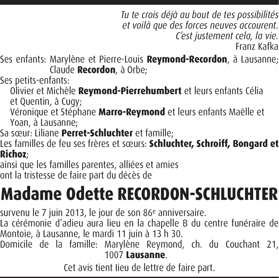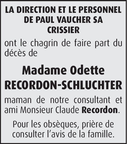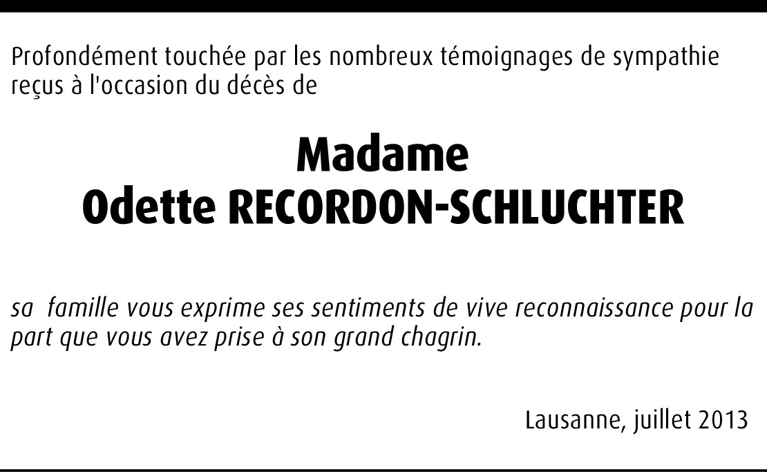 Il y a plus de 4 ans Signaler A Claude Recordon: Reçois toute ma sympathie dans ce moment douloureux de la séparation et mes sincères condoléances. De la part de Marlyse Ermini-Desponds
