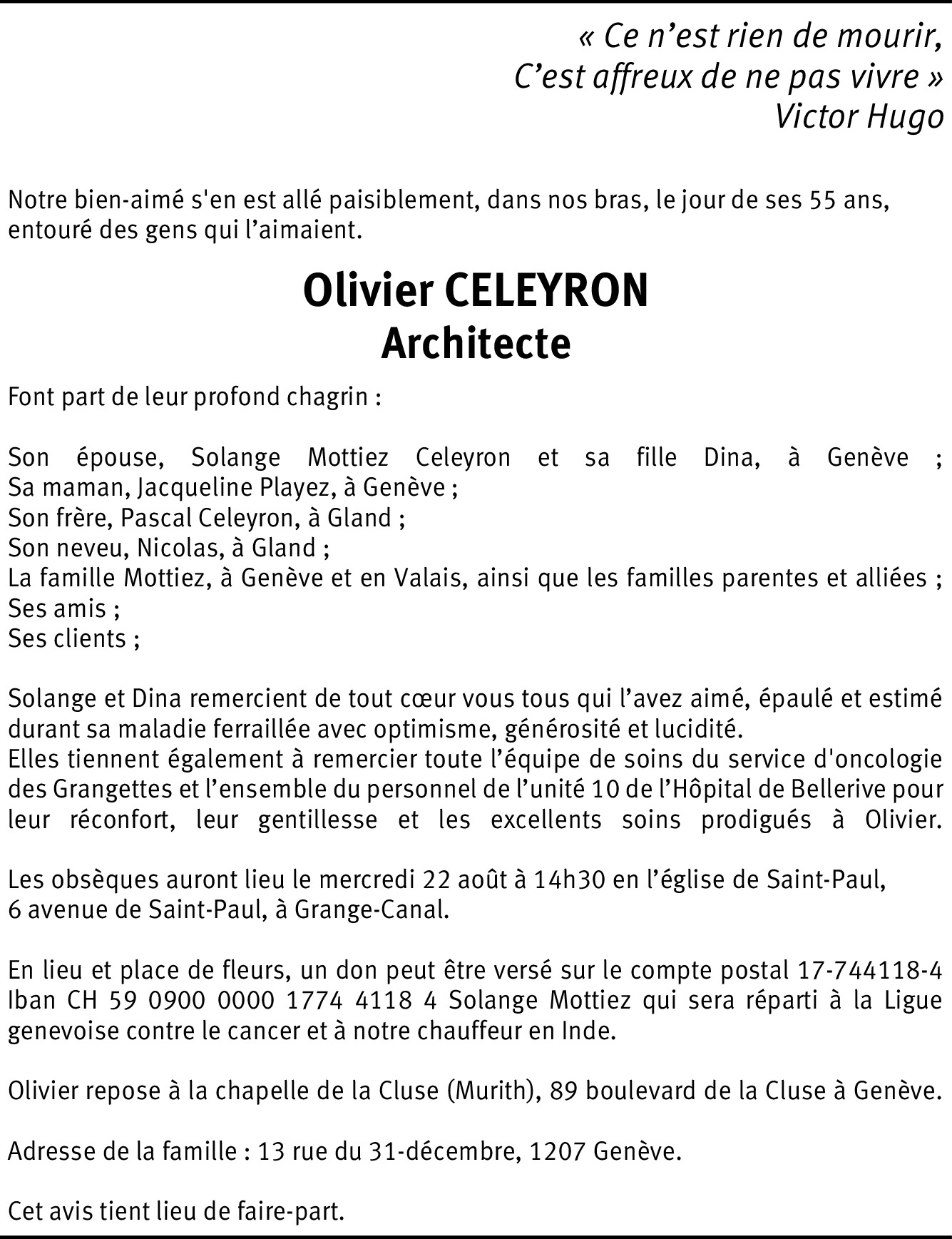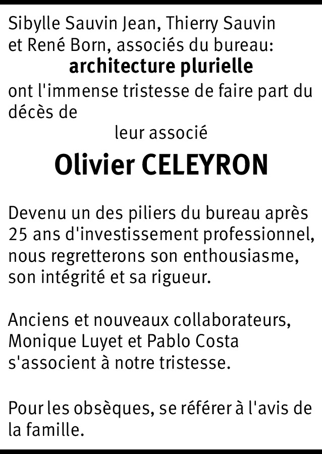 Olivier était un confrère joyeux, un mentor généreux, un esthète rigoureux et avant tout un ami précieux. Son sourire, son talent et son audace pétilleront à jamais dans mes plus tendres souvenirs. Permettez-moi de vous apporter toute mon amitié dans ces difficiles moments, et de vous offrir mes plus sincères condoléances. Avec toute mon affection. Florent.
