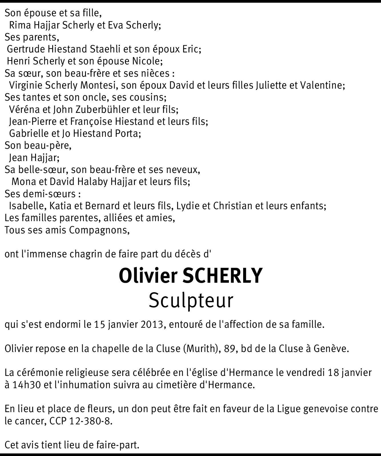 Cher Olivier, Bien que les fleurs se fanent, meurent et disparaissent, leurs précieux parfums demeurent toujours. Tout comme ces fleurs éclatantes, ceux que nous aimons ne meurent jamais ; ils demeurent avec nous à jamais, et quand la douleur aura disparu, il restera les meilleurs souvenirs. « Et moi, je te dis (Jésus s'adresse à l'apôtre Pierre) que tu es Pierre, et que sur cette pierre je bâtirai mon Église, et que les portes du séjour des morts ne prévaudront point contre elle. Je te donnerai les clefs du royaume des cieux : ce que tu lieras sur la terre sera lié dans les cieux, et ce que tu délieras sur la terre sera délié dans les cieux. » Là vers le Seigneur je sais que l'on se retrouvera, tu resteras à tout jamais dans nos coeur, même si ton absence est difficile à supporter. Que ton repos soit doux,et merveilleux. À sa famille, je présente mes pensées émues ainsi que toute mon amitié. Nicolas Gavillet.