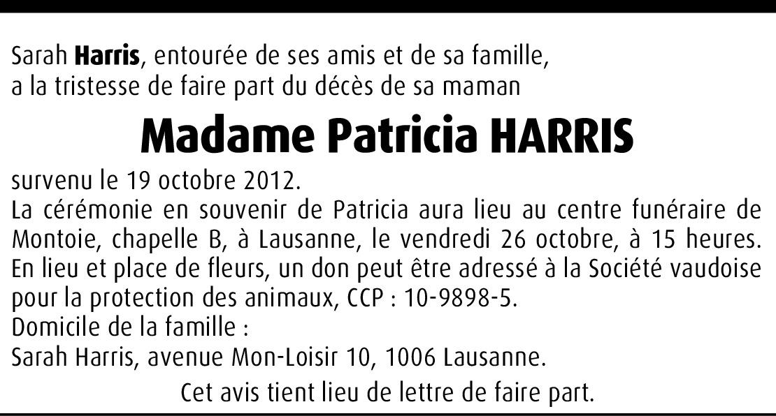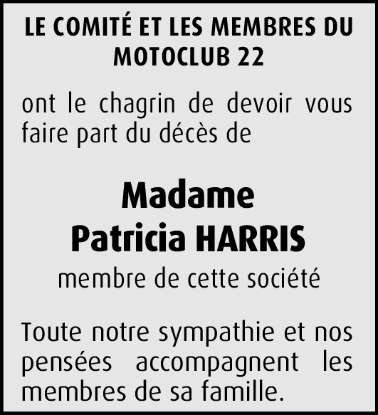 Patricia, Le 12 mars 1986, tu as été admise au sein du MC 22, en compagnie de 19 autres amies et amis. Un grand jour pour le MC ! : 20 nouveaux à la fois dont une Anglaise. Cette Anglaise, c'était toi, Patricia Harris, presque 42 ans et 100% ado. Depuis, ton sourire a illuminé notre Club. Tes boutades, ton humour, ont toujours rendu nos rencontres agréables. Même tes retards, prévisibles et permanents, finissaient par nous faire sourire. Avec toi, que de souvenirs partagés : l'Irlande - que tu nous as contraints à parcourir à l'envers! - la Sicile, le sud de l'Italie, le Stelvio dans la neige, la Roumanie, l'Alsace et tant d'autres sorties à moto qui nous ont marqués à jamais. Et puis la maladie, celle qui ajoute à la maladie l'horreur de ne plus reconnaître ni communiquer avec les siens et ses proches. Cette monstrueuse calamité qui t'a fait partir avec 20 ans d'avance, toi qui n'a jamais eu moins de 20 minutes de retard ! Merci pour tout Patricia, même si je n'ai jamais eu autant de chagrin depuis le décès de ma maman. Et aussi merci à Sarah et Jo qui ont l'ont si bien entourée depuis le début de sa maladie jusqu'à ce triste 19 octobre 2012. Merci aussi à ceux qui l'ont aimée et soutenue. Ton ancien président.