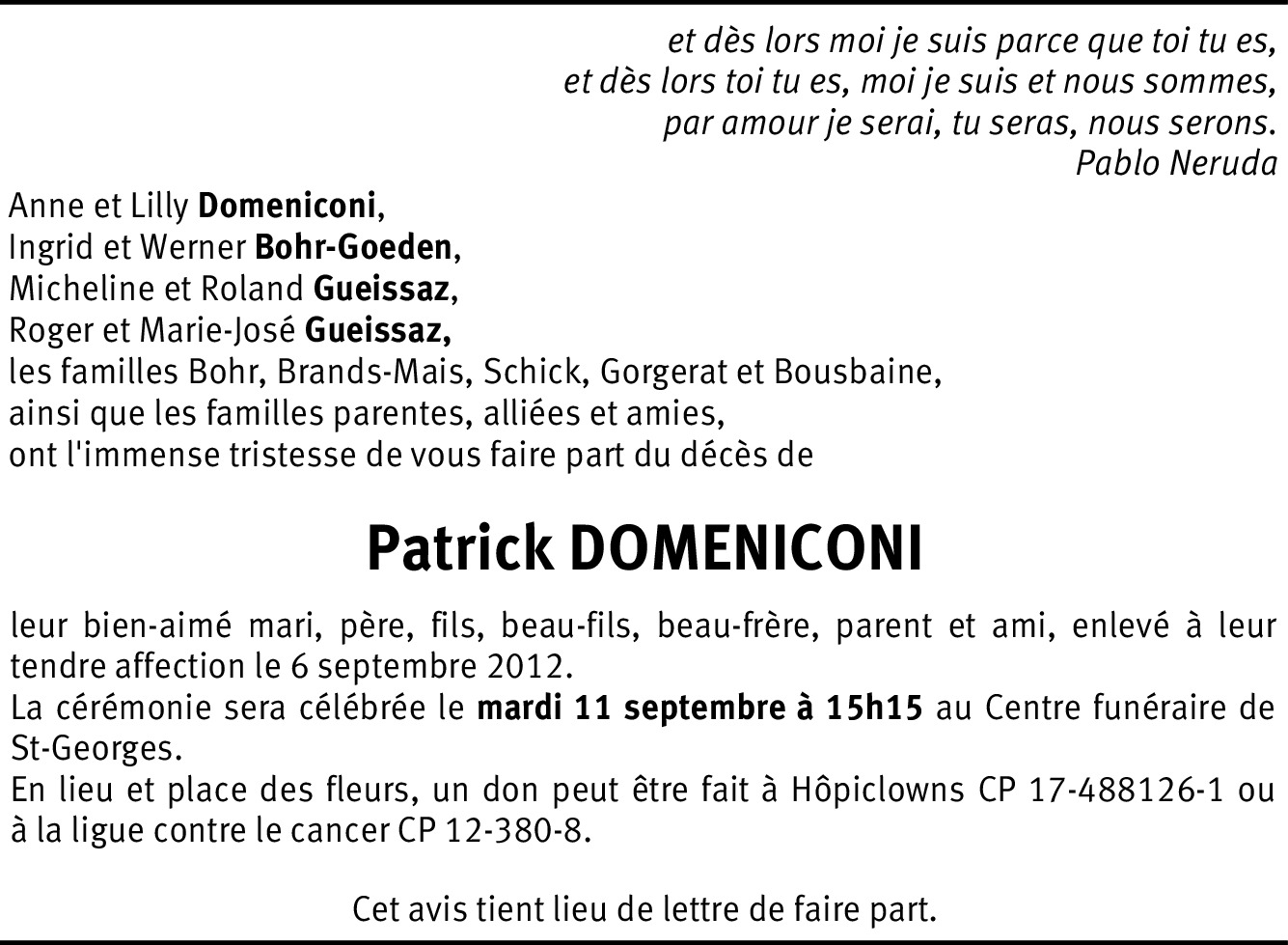 Sachez que Vous avez toute mon Empathie, et même si je sais qu'aucun mot, ou paroles ne pourraient vous consoler, je me permets de vous envoyer toutes mes sincères condoléances. Je vous souhaite d'être très entourées, par l'amour de vos proches. Avec toute mon Affection. Valérie(crèche Coquelibulle).
