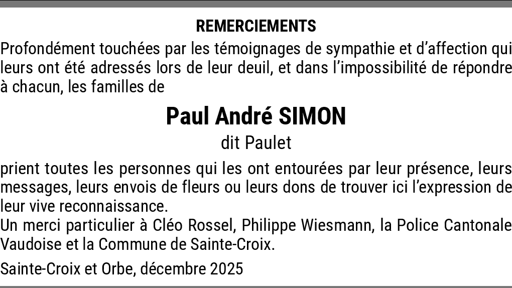 Paul André Simon 04.12.2025 Report Chère famille et amis, je vous présente mes plus sincères et chaleureuses condoléances pour Paul Simon, victime de la folie humaine, de la barbarie c est un crime odieux Que son âme repose en Paix, Lysiane Mercier De la part de MERCIER LYSIANE