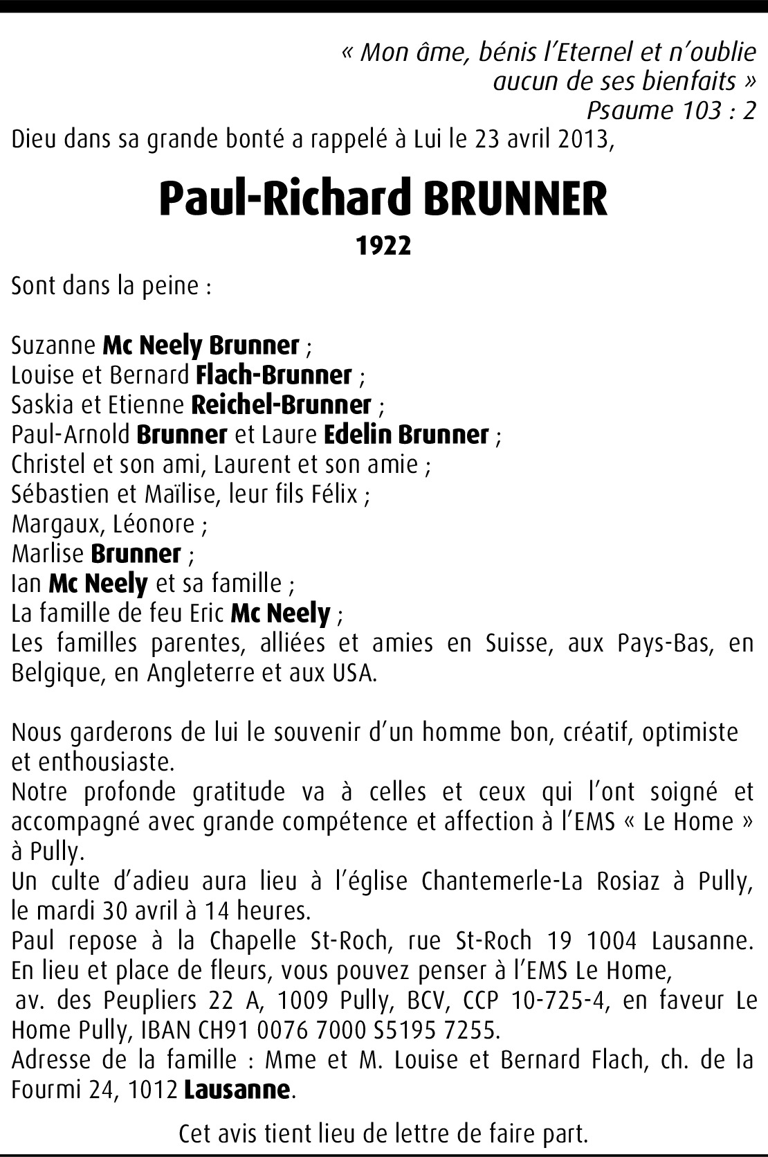 Toute ma sympathie pour le décès de M. Brunner à sa femme, ses enfants et conjoints. M. Brunner me laissera un souvenir sur le positif de la vie et l'envie d'avancer vers le futur, quand bien même la mort vous attend.