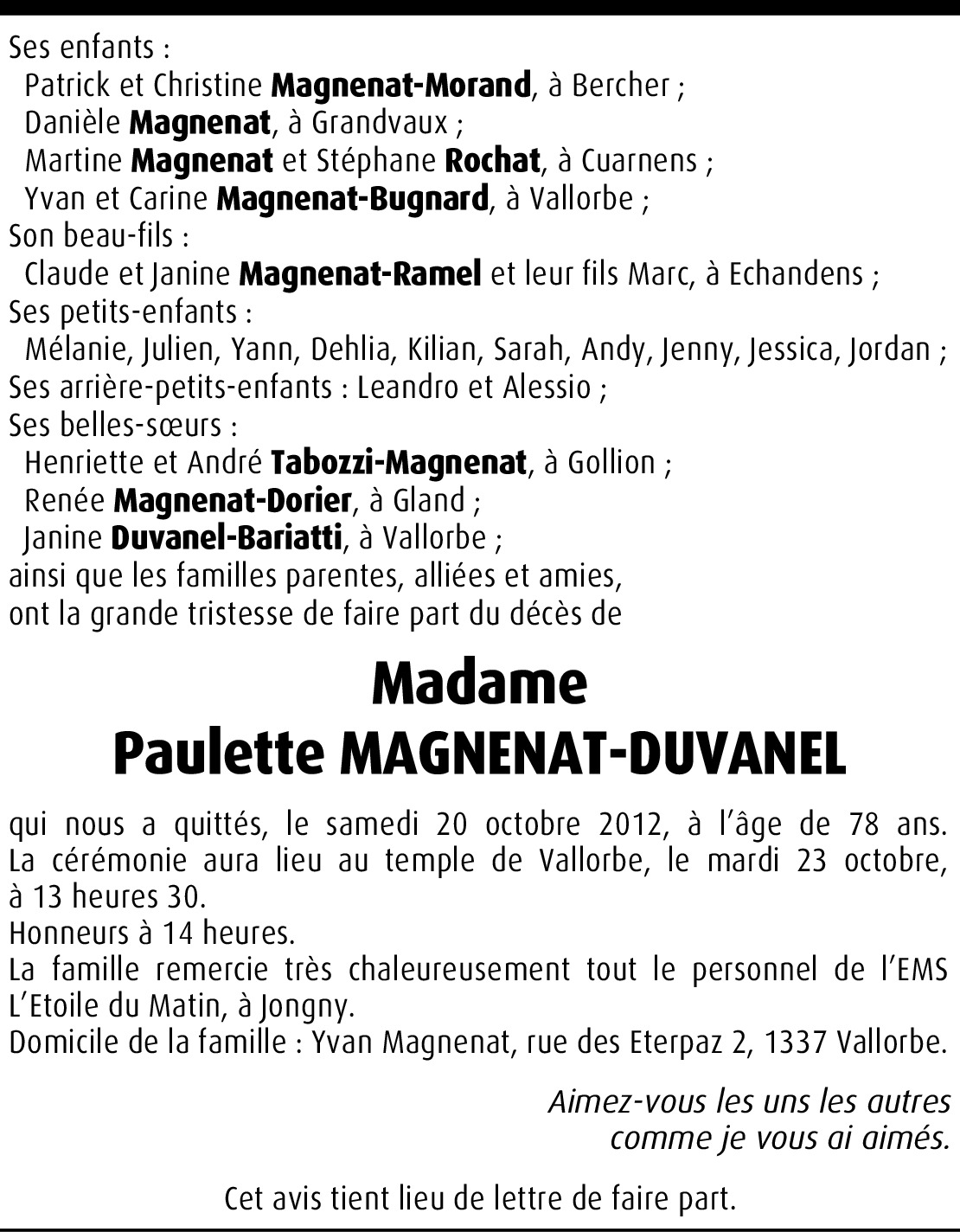 Il y a plus de 4 ans Signaler Chers amis, c'est depuis le Canada que je vous envoie mes sincères condoléances pour le départ de votre maman et grand-maman, belle-soeur (pour Jeanine) et amie de plusieurs. De la part de Jean Daniel Vallotton (dit Calo)